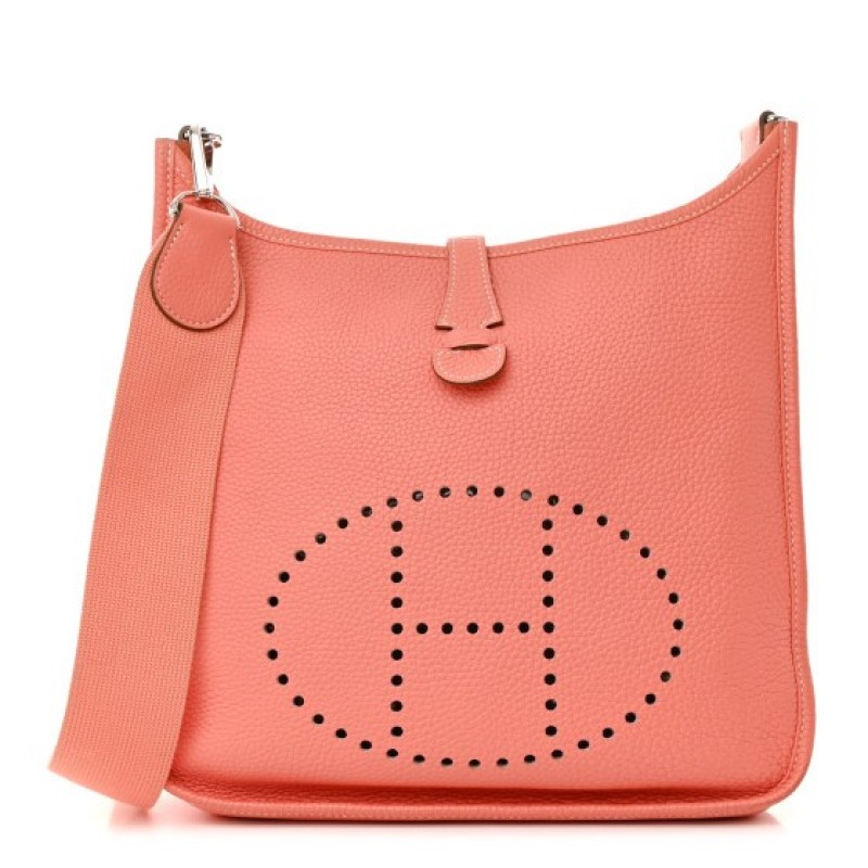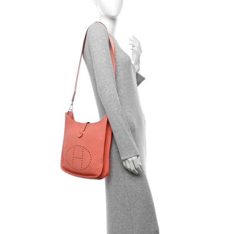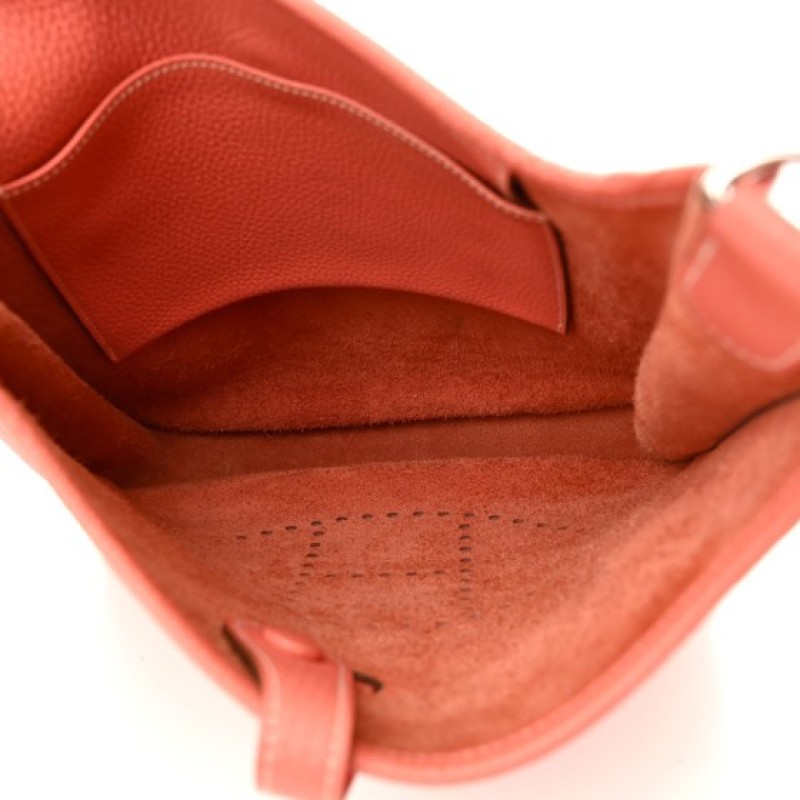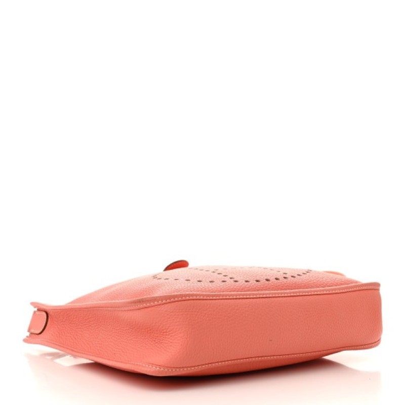 This is an authentic HERMES Taurillon Clemence Evelyne PM in Crevette. This stylish messenger bag is crafted of fine Taurillon Clemence calfskin leather in light orange. This bag features a canvas shoulder strap, palladium hardware, and a perforated Hermes H oval on the front of the bag. The top of the bag opens with a crossover strap to a matching suede interior.
