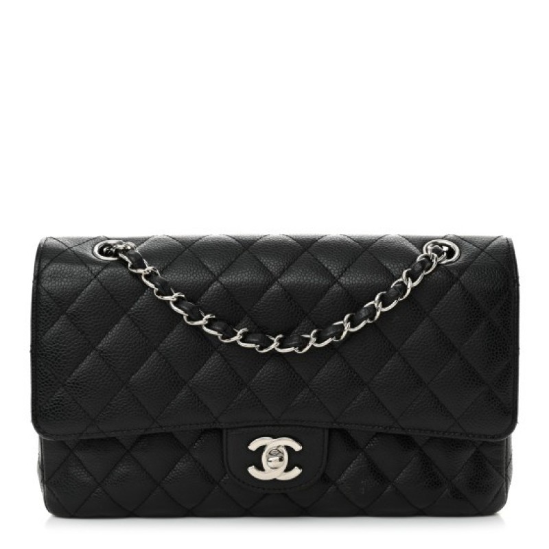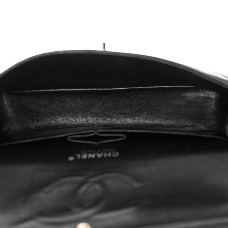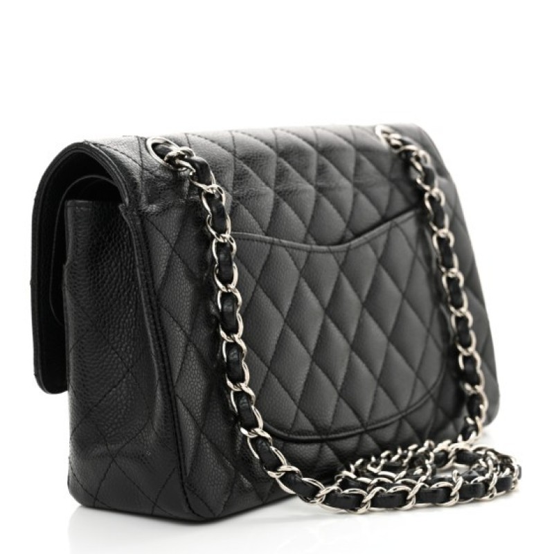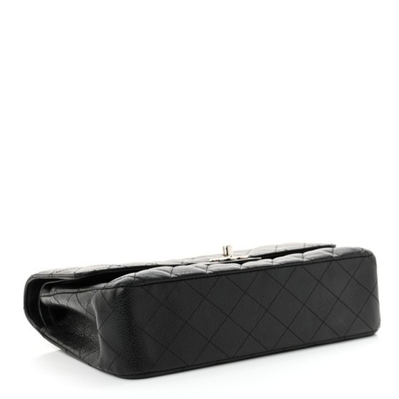 This is an authentic CHANEL Caviar Quilted Medium Double Flap in Black. This elegant shoulder bag is crafted of luxurious caviar textured leather in black. The bag features a leather-threaded silver chain-link shoulder strap, a rear patch pocket, and a crossover flap with a silver classic CC turn lock. The flap opens to reveal an inner flap and a black leather interior with pockets.