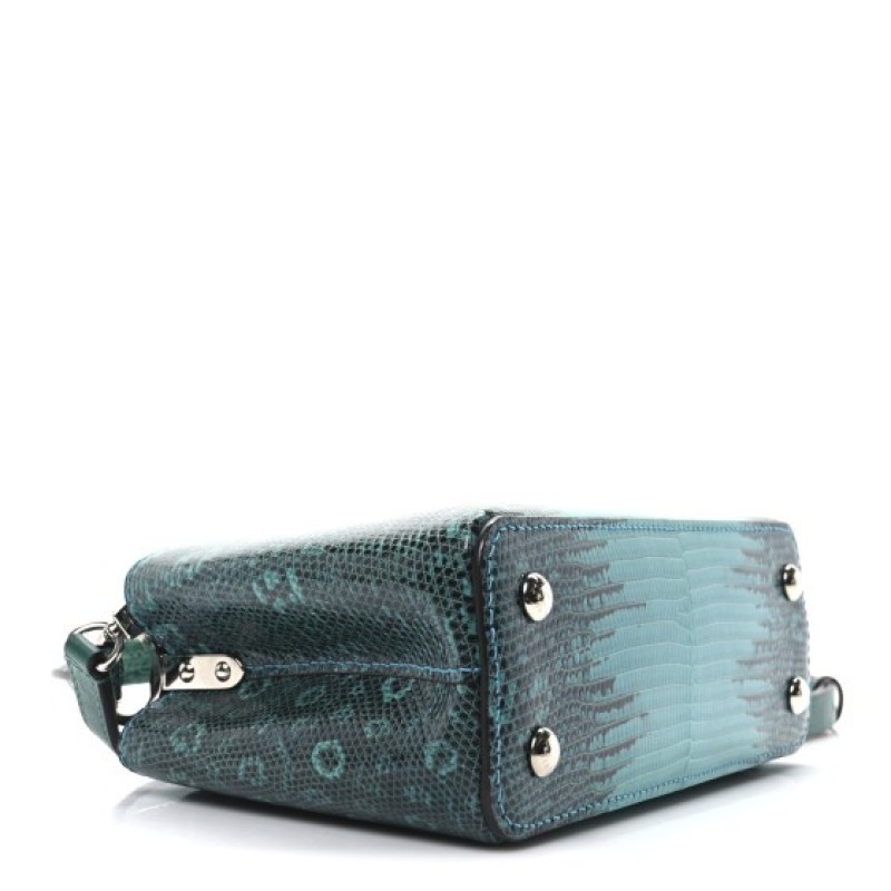 This authentic LOUIS VUITTON Lizard Capucines Mini in Curacou and Emeraude. This mini handbag is crafted of green and black lizardskin with a matching top handle and removable adjustable green calfskin leather crossbody strap. The crossover flap opens to a partitioned blue leather interior with a patch pocket.