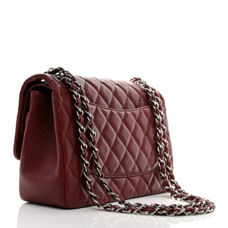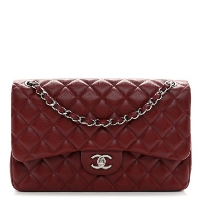 This is an authentic CHANEL Caviar Quilted Jumbo Double Flap in Dark Red. This large classically structured shoulder bag is crafted of sturdy, luxurious red diamond quilted caviar leather that has texture and depth. The bag features silver chain link leather threaded shoulder strap, a rear pocket, and a silver CC turn-lock. This opens to an inner flap and leather interior with pockets.