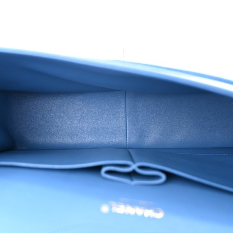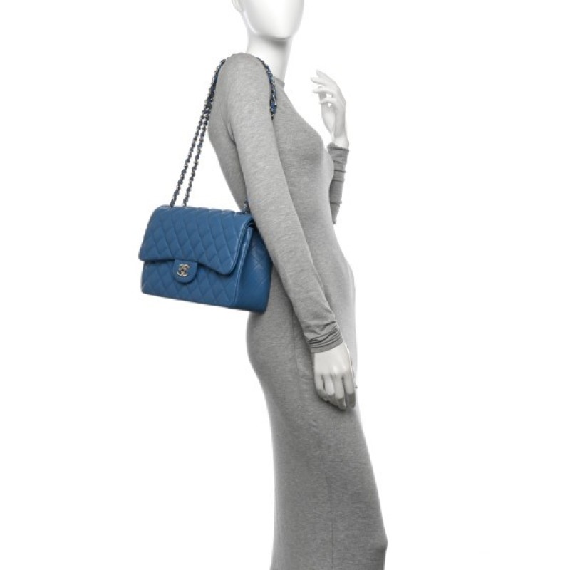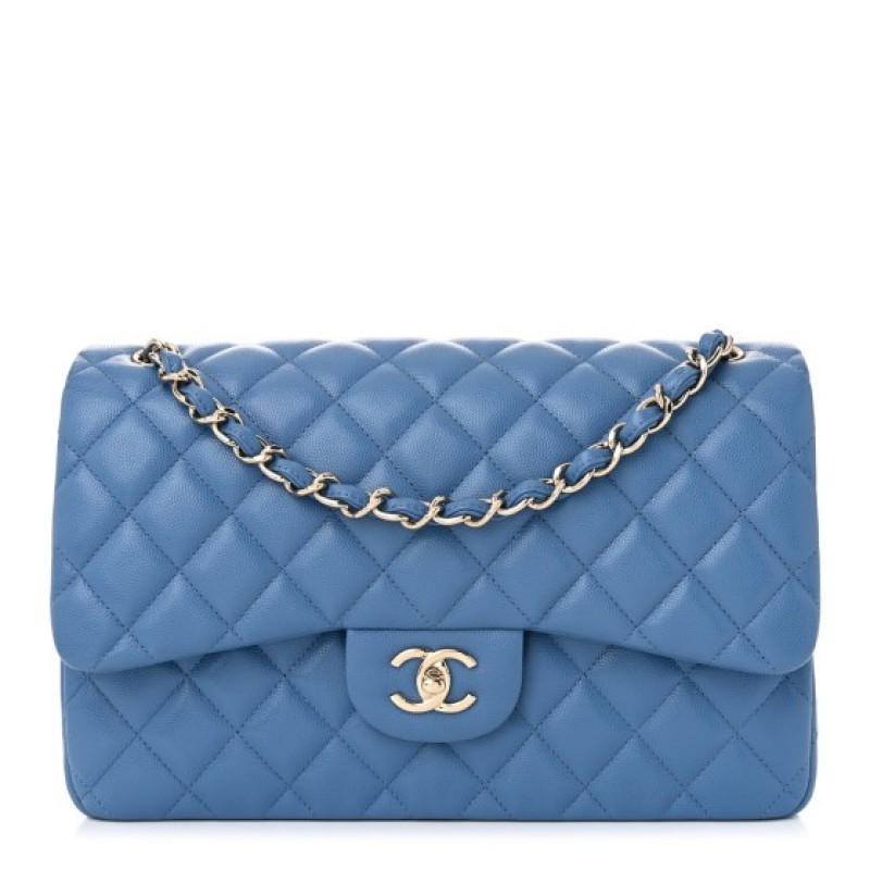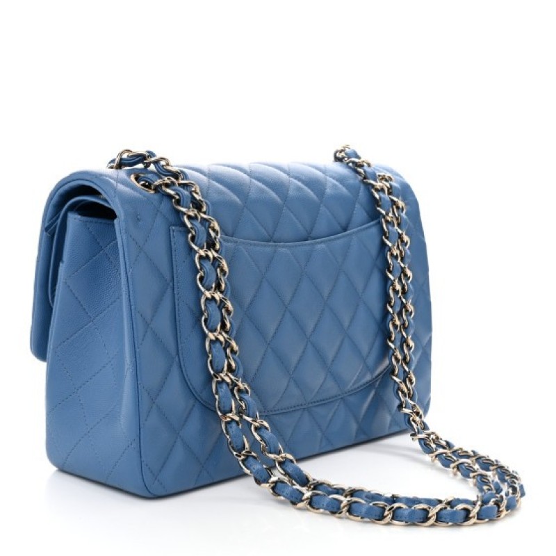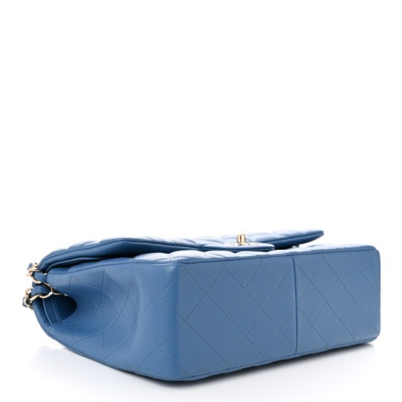 This is an authentic CHANEL Caviar Quilted Jumbo Double Flap in Blue. This stylish shoulder bag is crafted of luxurious caviar textured leather in light blue. It features a leather-threaded silver chain-link shoulder strap, a rear patch pocket, and a front flap with a silver CC turn lock. The flap opens to an inner flap and matching leather interior with patch pockets.