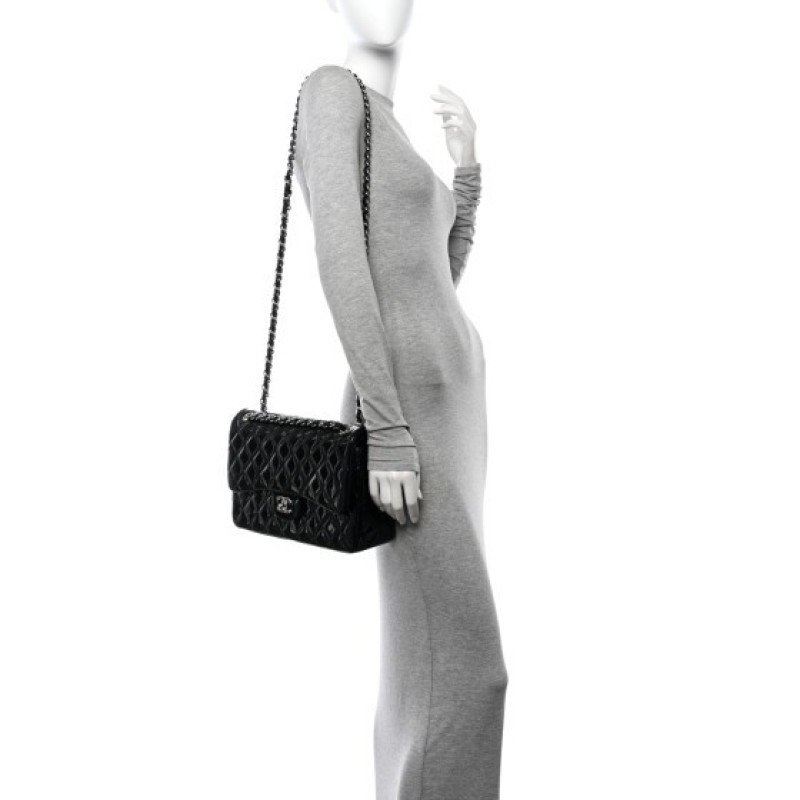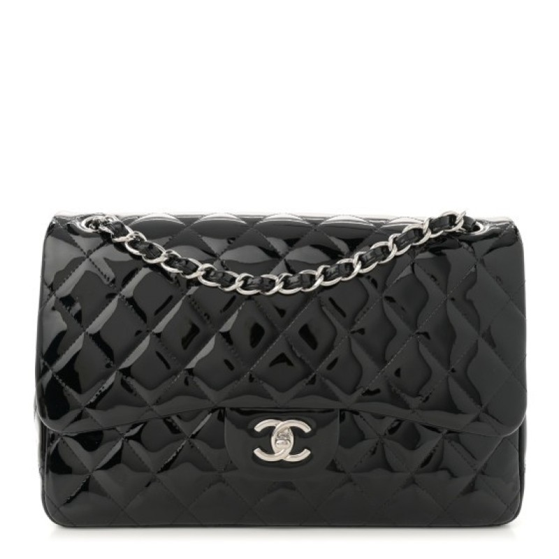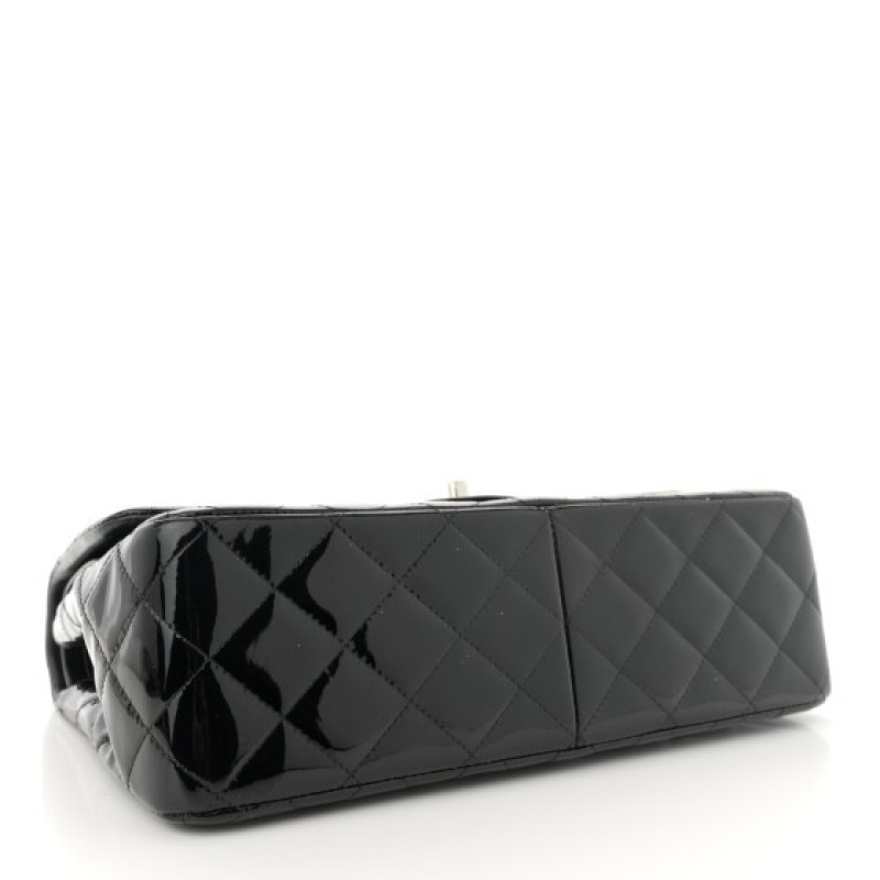This is an authentic CHANEL Patent Quilted Jumbo Double Flap in Black. This classic shoulder bag is crafted of luxurious diamond quilted glossy patent leather in black. The bag features silver chain link leather threaded shoulder straps and a facing silver Chanel CC turn lock. This opens the facing flap to reveal an inner flap and a matte black leather interior with patch pockets.