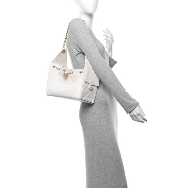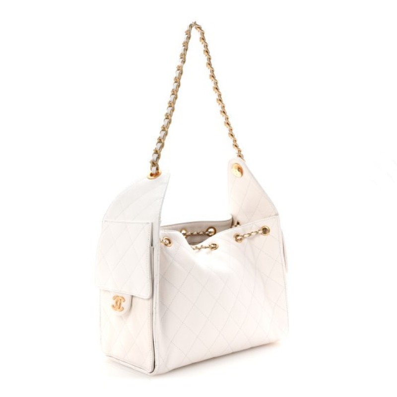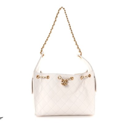 This is an authentic CHANEL Caviar Quilted 25 Small Handbag in White. This chic shoulder bag is crafted of diamond quilted caviar leather in white. It features magnetic flap pockets at the sides, a leather-threaded gold-toned chain strap, and a leather-threaded gold-toned top cinch cord with aged gold CC logo adjustment button. This opens the bag to a beige fabric interior with side patch pockets and a leather card slot.