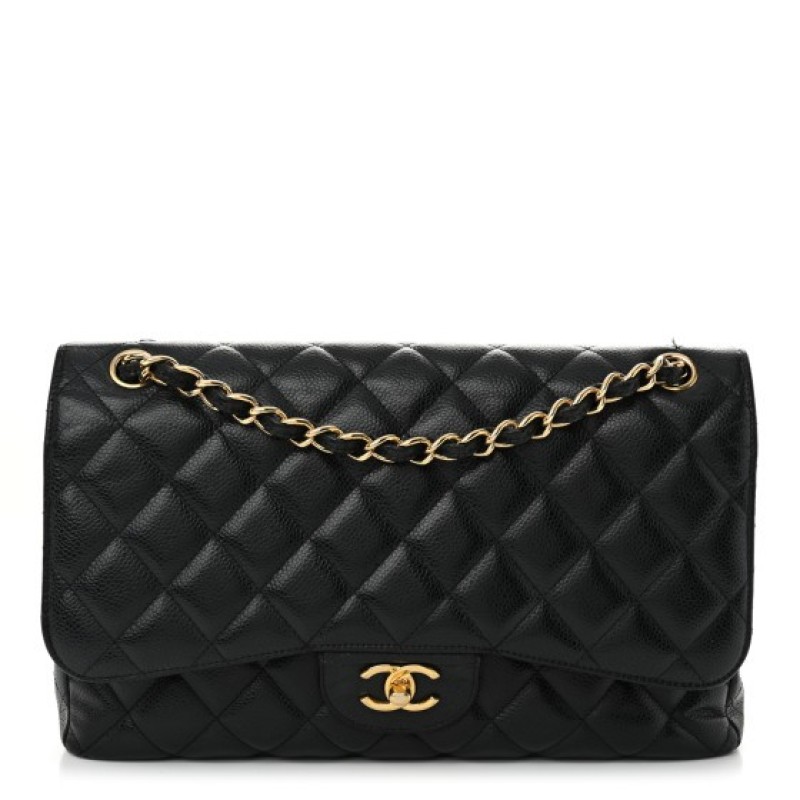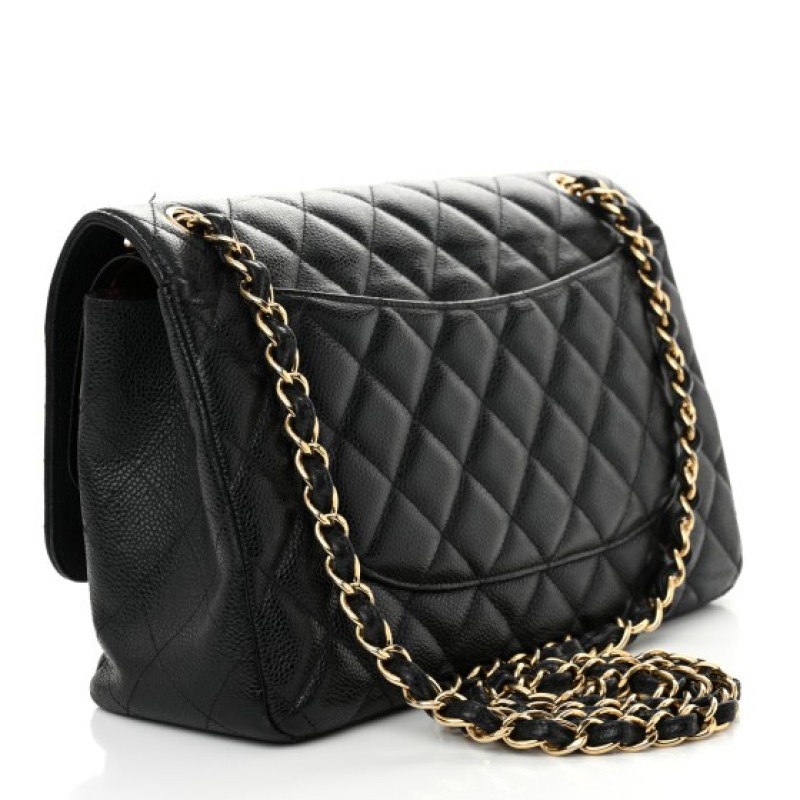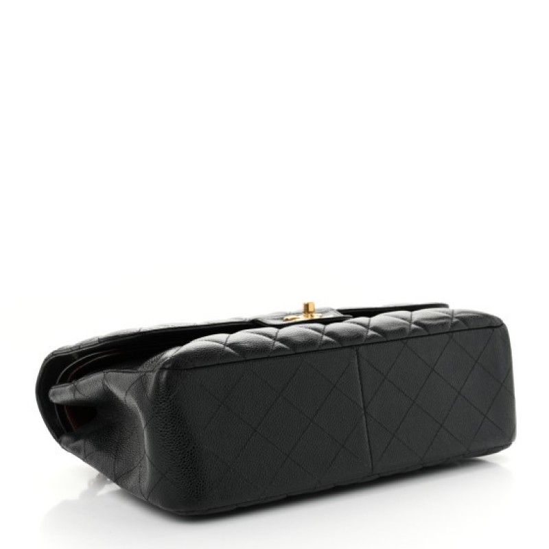 This is an authentic CHANEL Caviar Quilted Jumbo Double Flap in Black. This stylish shoulder bag is crafted of luxurious caviar textured leather in black. It features leather threaded polished gold chain link shoulder straps, a rear patch pocket, and a front flap with a gold CC turn lock. The flap opens to a second flap and a Bordeaux leather interior with patch pockets.