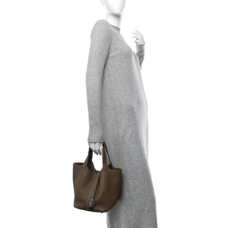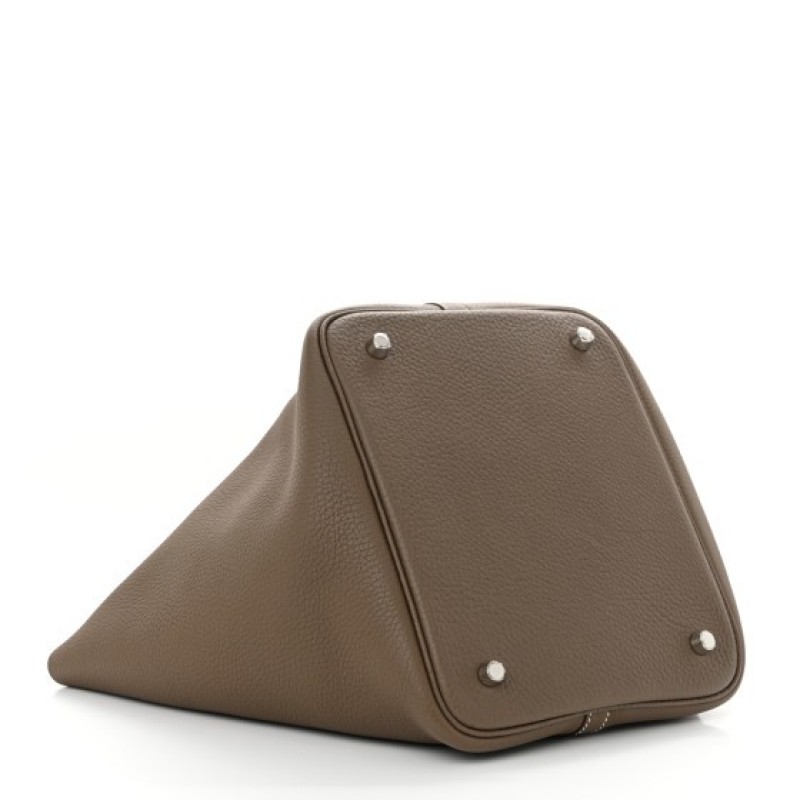 This is an authentic HERMES Taurillon Clemence Picotin Lock 22 MM in Etoupe. This stunning tote is crafted of luxuriously soft Clemence calfskin leather in taupe, in a relaxed bucket style, with polished palladium hardware. The bag features a unique one-piece reinforced design with leather top handles and a thin cross-over strap. The top is open to a matching suede interior.