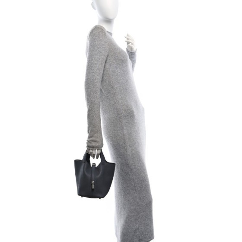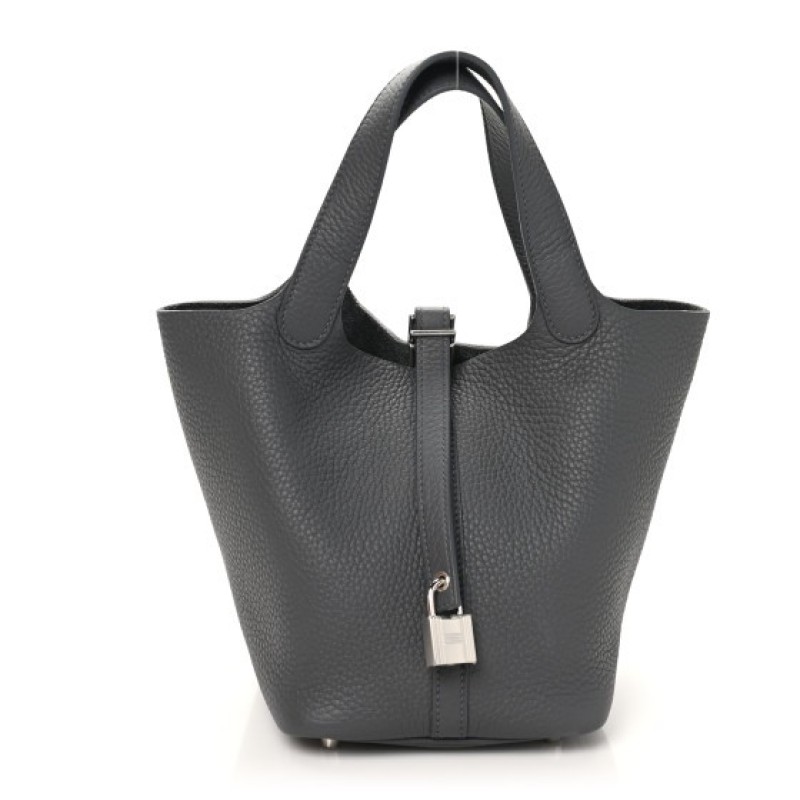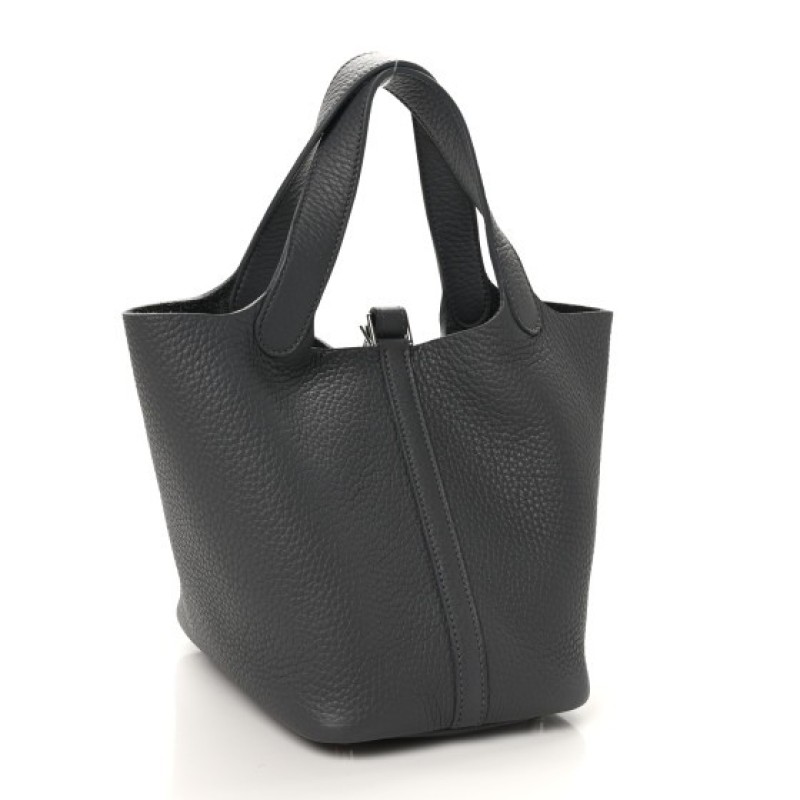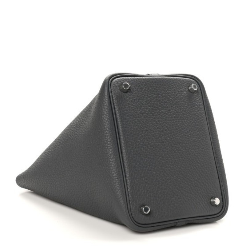 This is an authentic HERMES Taurillon Clemence Picotin Lock 18 PM in Ardoise. This tote is crafted of soft taurillon clemence calfskin leather in dark grey with polished palladium-plated hardware. This tote is a one-piece handbag with strap handles that extend from the sides with an extra layer of leather for support. The bag opens to a matching suede interior.
