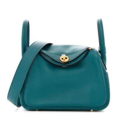 This is an authentic Hermes Swift Mini Lindy 20 in Vert Bosphore. This mini shoulder bag is crafted of calfskin leather in teal. The bag features rolled leather top handles, connected with a unique looping shoulder strap and polished gold hardware. The top zippers open to a matching leather interior with patch pockets.