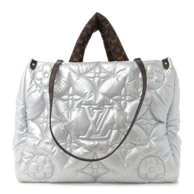 This is an authentic LOUIS VUITTON Econyl Monogram Pillow Giant Onthego GM in Silver. This limited edition tote features an oversized stitched monogram pattern on a metallic silver nylon textile. The bag features brown nylon monogram top handles and coated canvas long shoulder straps that can be tucked away inside the bag, accented with polished silver hardware. The top is open to a spacious brown monogram nylon interior with zipper and patch pockets.