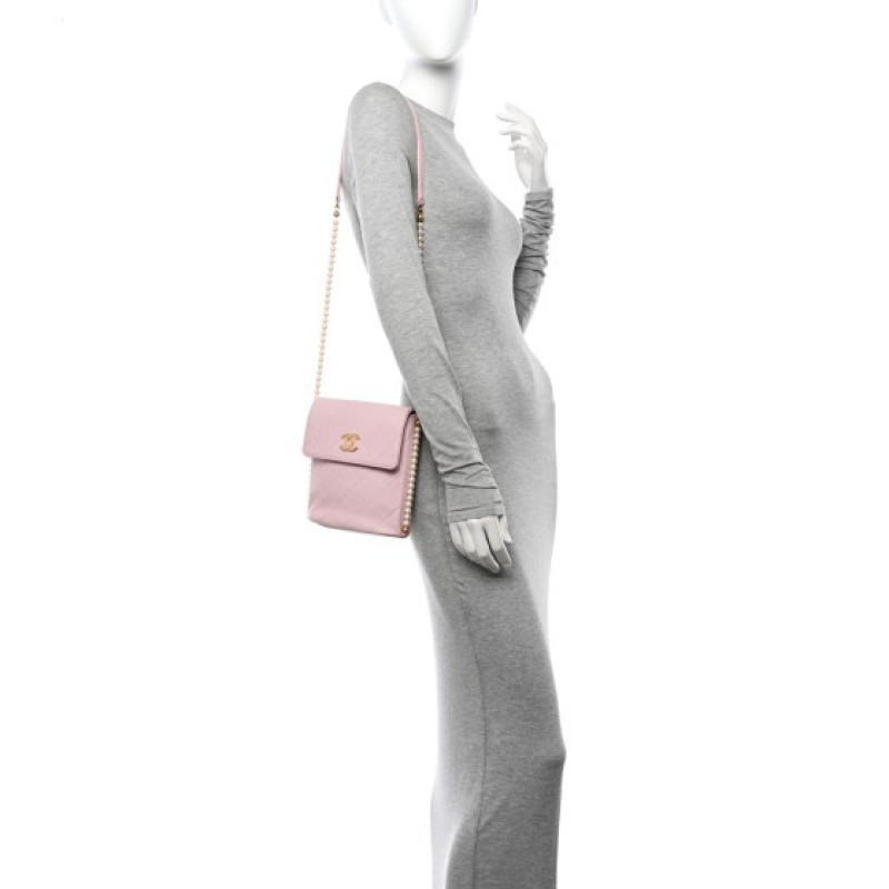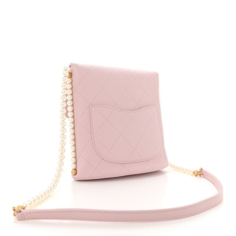 This is an authentic CHANEL Calfskin Quilted Pearl Small About Pearls Hobo Bag Light Pink. This chic and stylish wallet is crafted of luxuriously soft pink diamond quilted lambskin leather. This crossbody bag features a pearl and aged gold lined crossbody shoulder strap with a shoulder pad and a crossover flap with an aged gold Chanel CC logo. The flap opens to a matching fabric interior with a patch pocket.