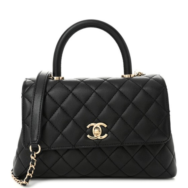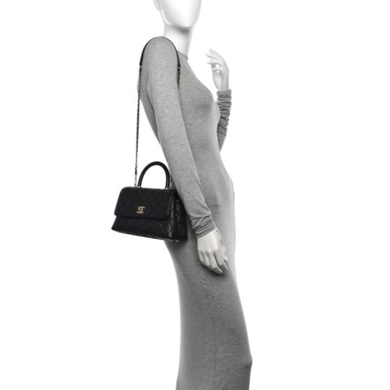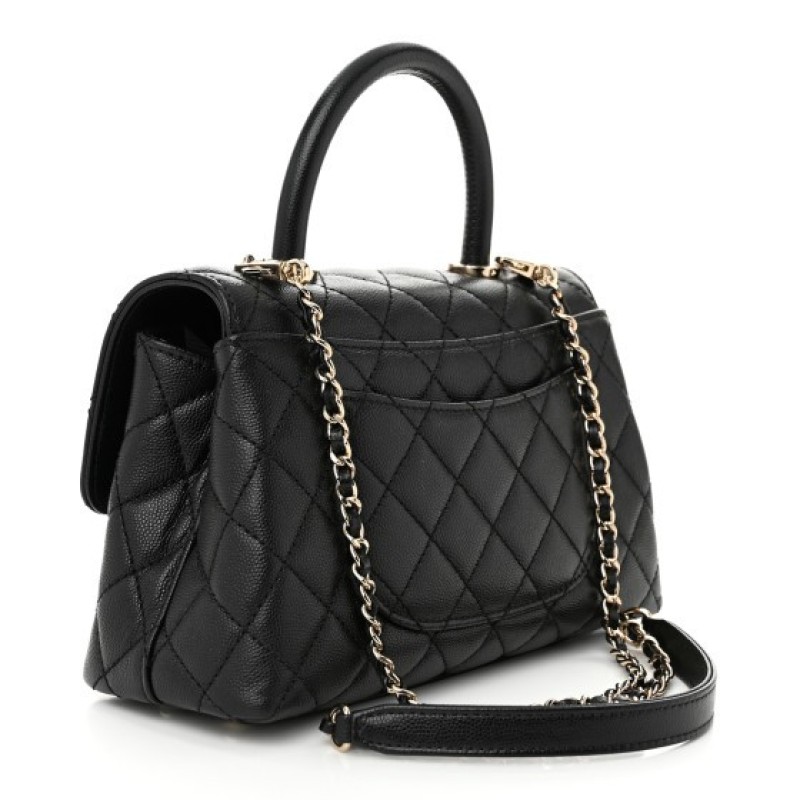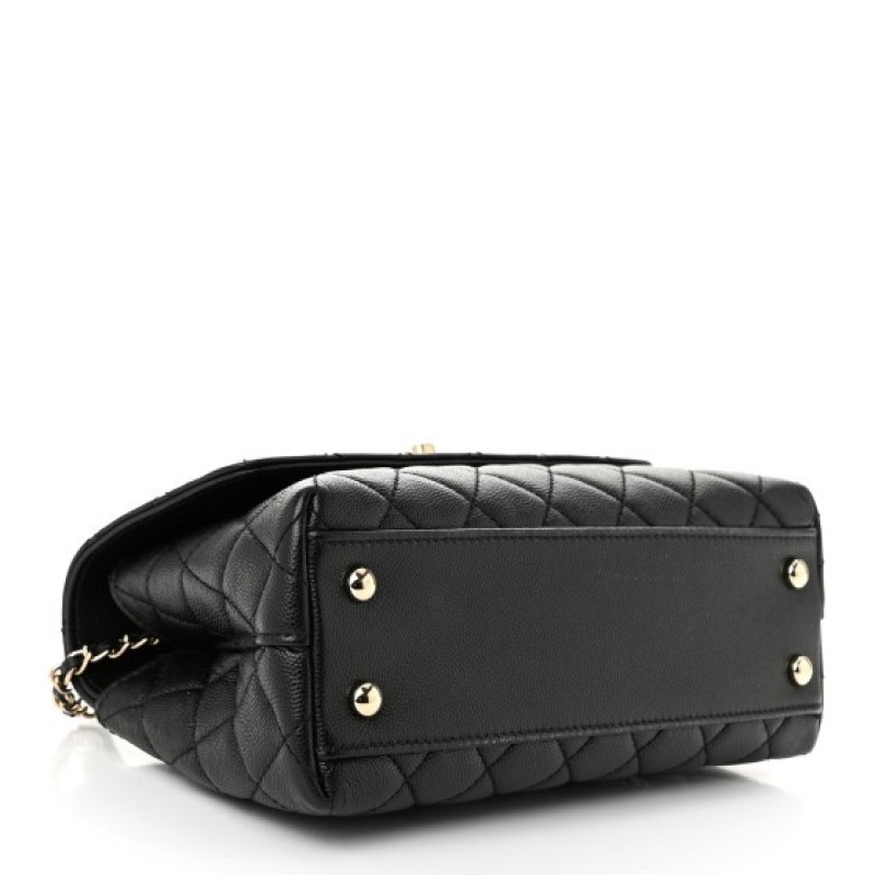 This is an authentic CHANEL Caviar Quilted Mini Coco Handle Flap in Black. This stylish and classic tote is crafted of diamond-stitched grained caviar leather in black. The shoulder bag features a black caviar top handle, a leather threaded light gold chain-link shoulder strap, and a CC turn-lock closure. The flap opens to a burgundy fabric interior with a central zippered compartment and pockets.