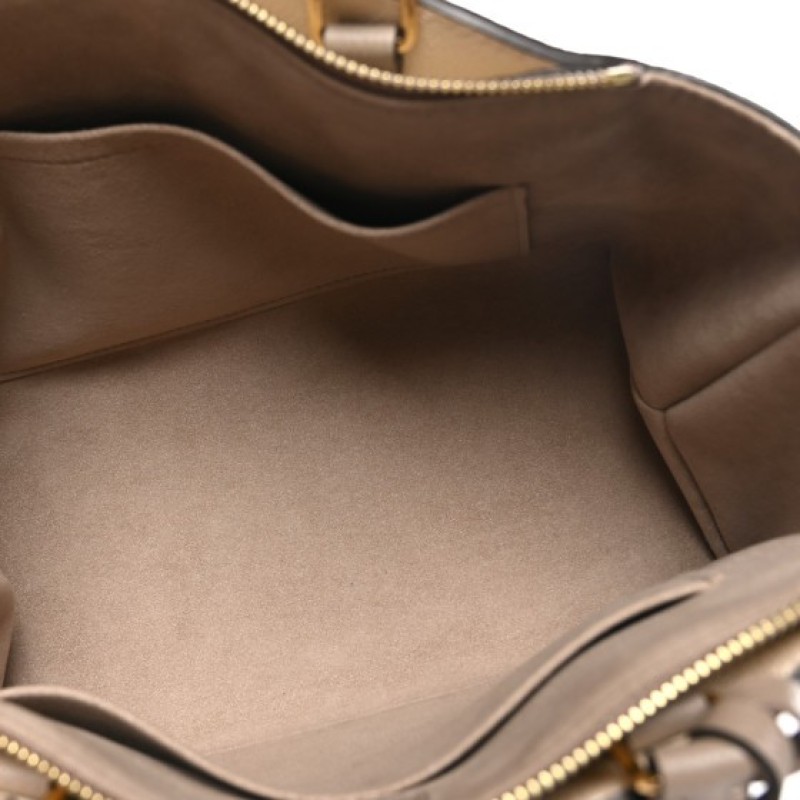 This is an authentic LOUIS VUITTON Empreinte Monogram Giant Petit Palais in Tourterelle Creme. This limited edition handbag features oversized versions of the classic Louis Vuitton monogram leather in beige. The bag features beige leather top handles and an additional adjustable strap. The top opens to a spacious gray interior with patch pockets.