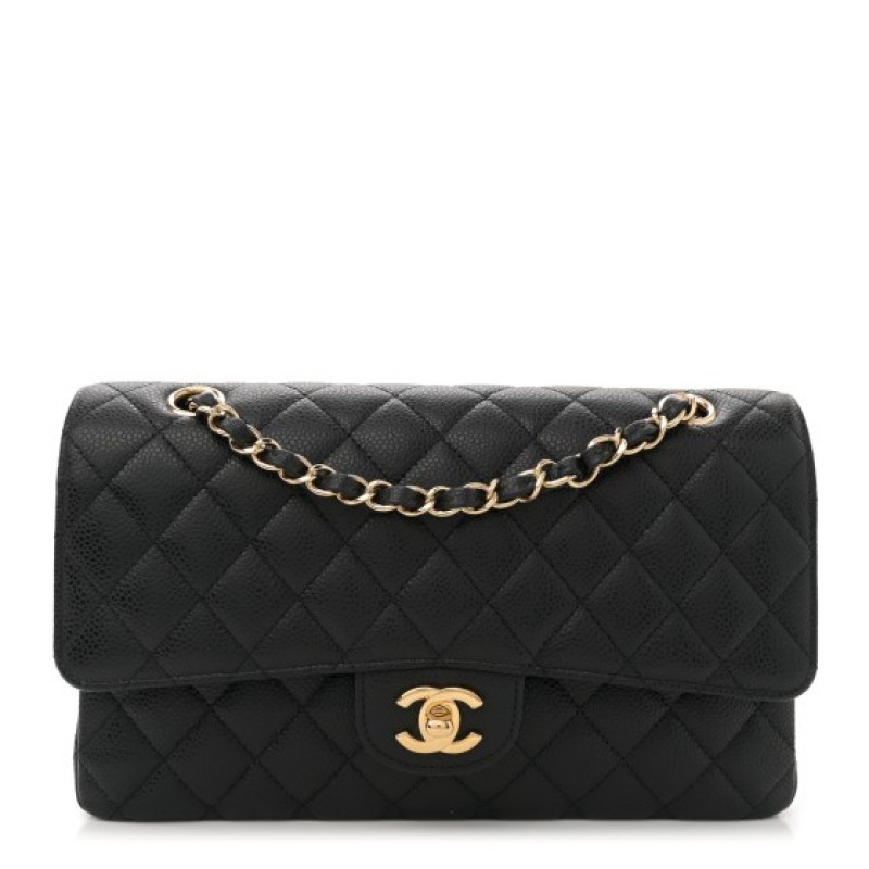 This is an authentic CHANEL Caviar Quilted Medium Double Flap in Black. This elegant shoulder bag is crafted of luxurious caviar textured leather in black. The bag features a leather-threaded gold chain-link shoulder strap, a rear patch pocket, and a crossover flap with a gold classic CC turn lock. The flap opens to reveal an inner flap and a burgundy leather interior with pockets.