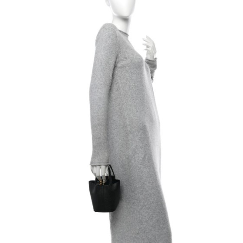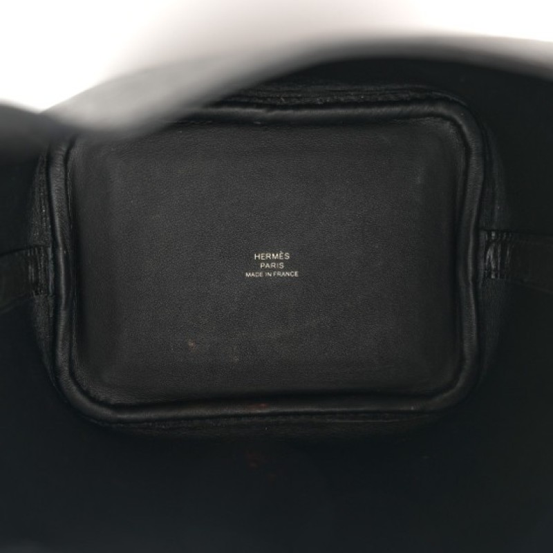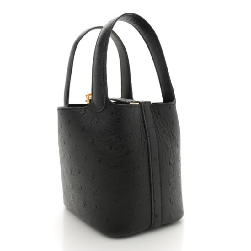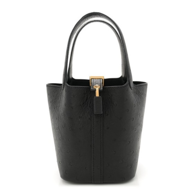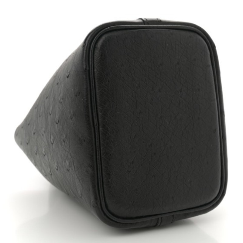 This is an authentic Ostrich Micro Picotin Lock in Black. This bucket bag is crafted of ostrich leather in black. It features top handles and gold hardware including a leather covered lock and a key. The top strap unlocks to a matching interior with a smooth leather base.
