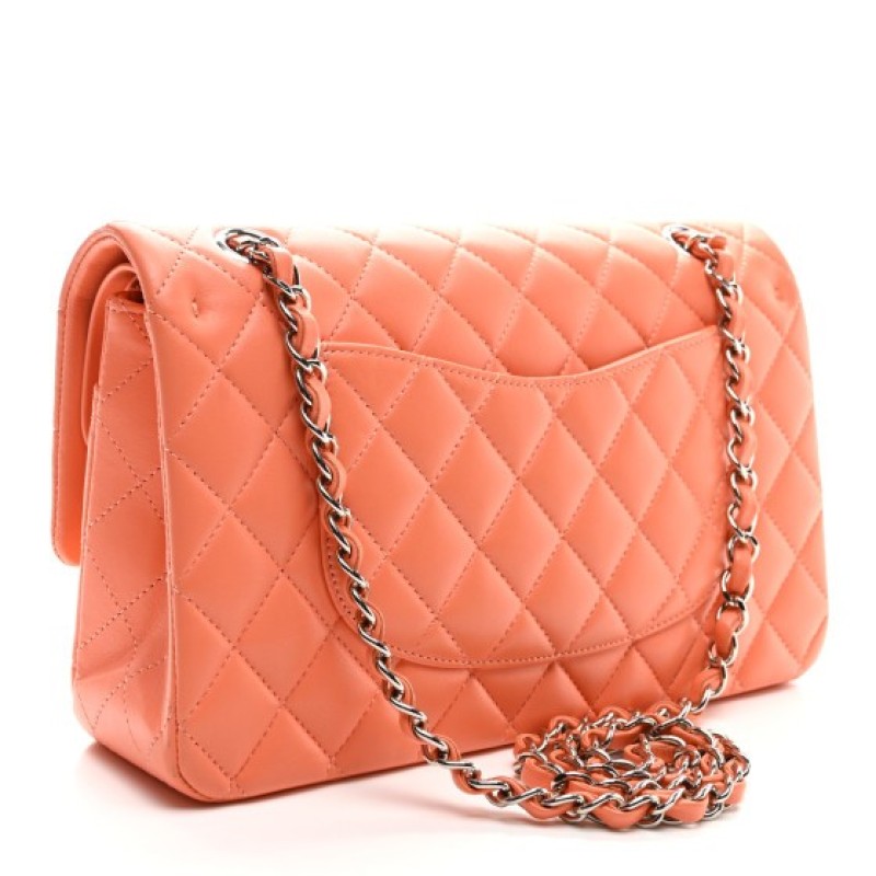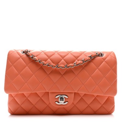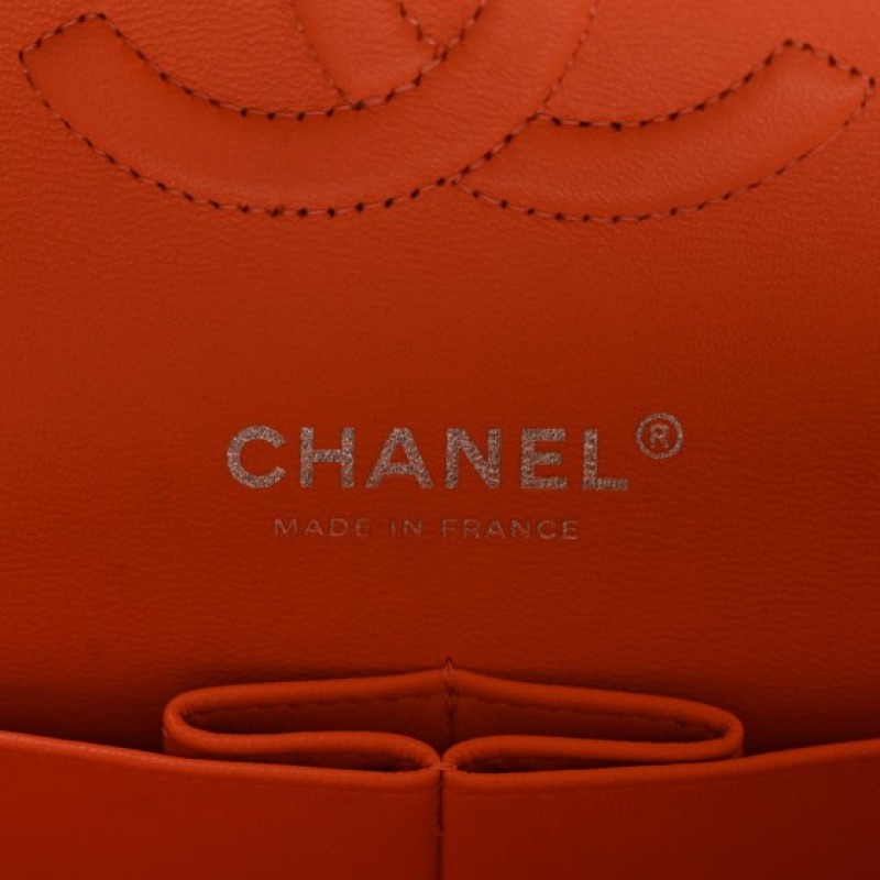 This is an authentic CHANEL Lambskin Quilted Medium Double Flap in Orange. This classic flap shoulder bag is crafted of orange diamond quilted soft lambskin leather. This shoulder bag features a rear patch pocket, a leather threaded matte gold chain and a facing gold Chanel CC turn lock. The flap opens to a matching orange leather interior with patch pockets.