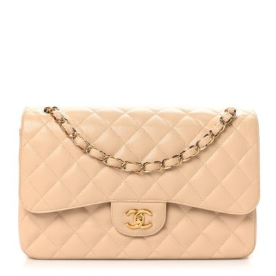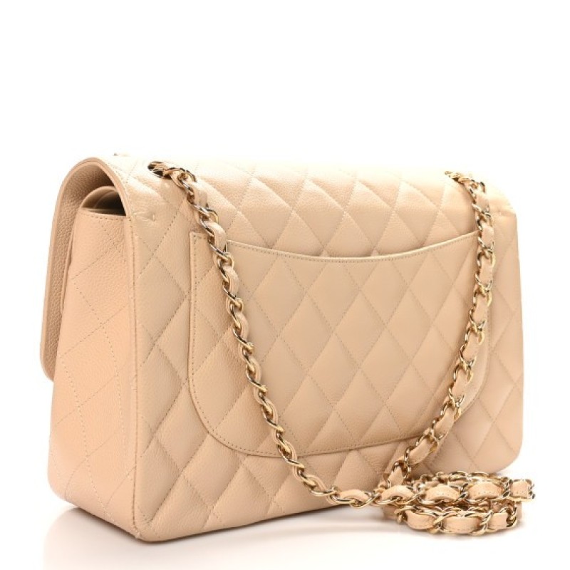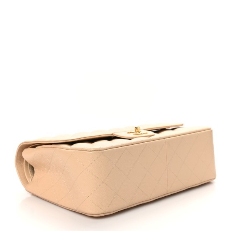 This is an authentic CHANEL Caviar Quilted Jumbo Double Flap in Beige Clair. This stylish shoulder bag is crafted of luxurious diamond quilted caviar leather in light beige. This bag features a leather threaded gold chain-link shoulder strap and a rear pocket. The Chanel CC turn-lock opens to an inner flap and matching leather interior with patch pockets.