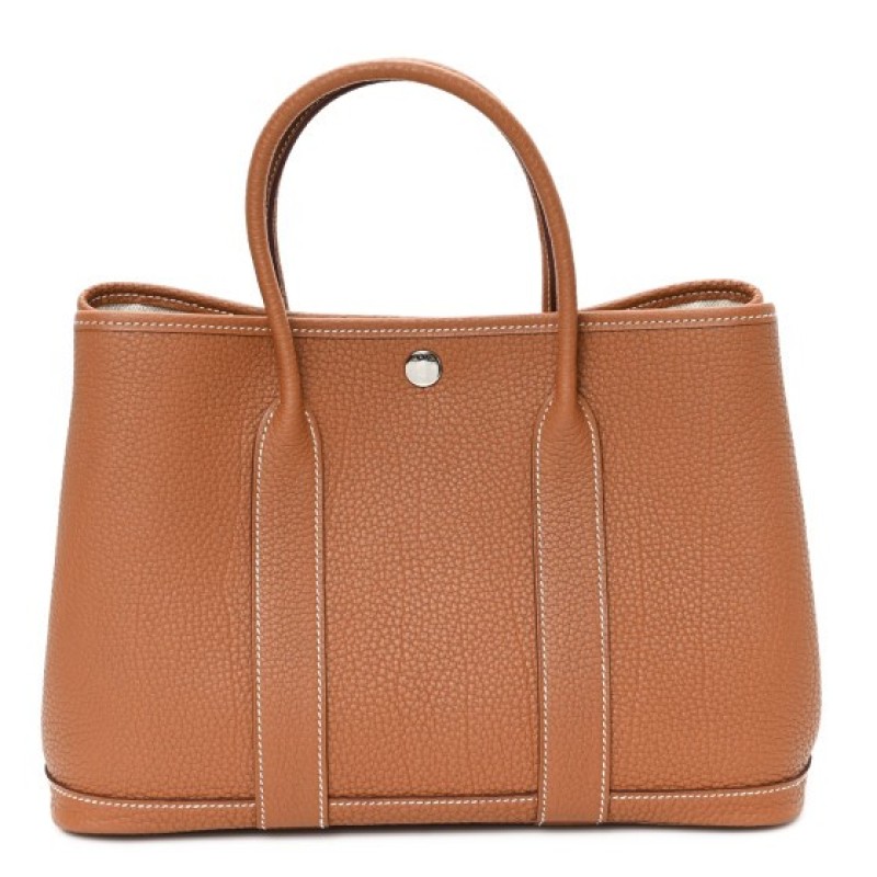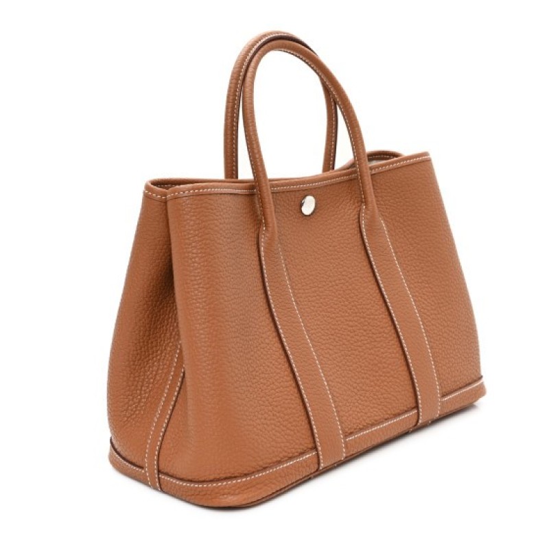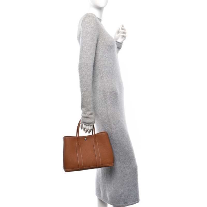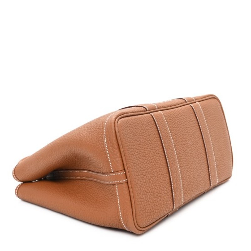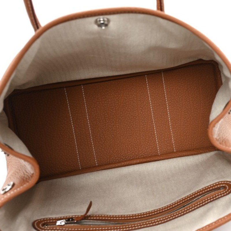This is an authentic HERMES Negonda Garden Party 30 TPM in Gold. This sophisticated tote is finely crafted of grained luxurious leather in brown. This is a stunning handbag that features rolled top handles, expandable sides, and palladium silver hardware. The top is open to a herringbone fabric interior with a zipper pocket and matching leather base.