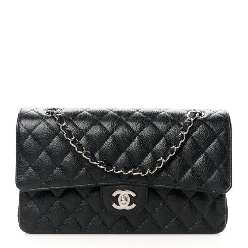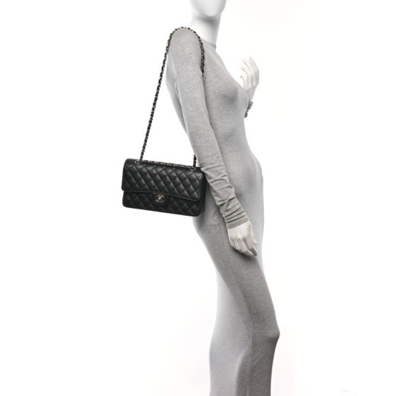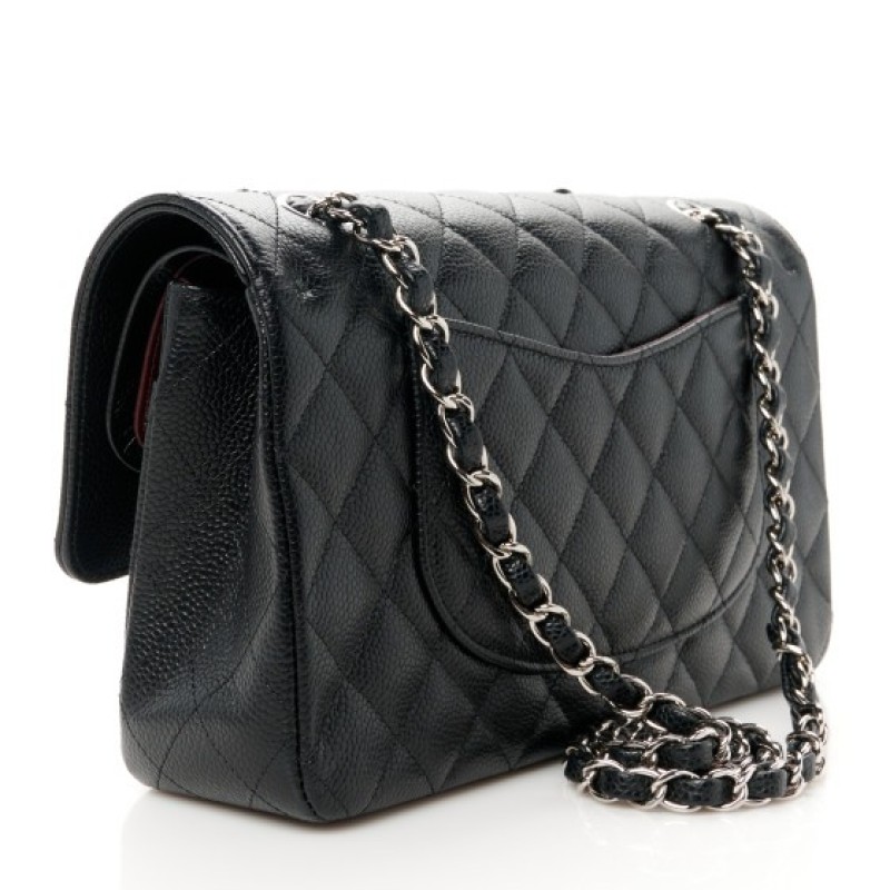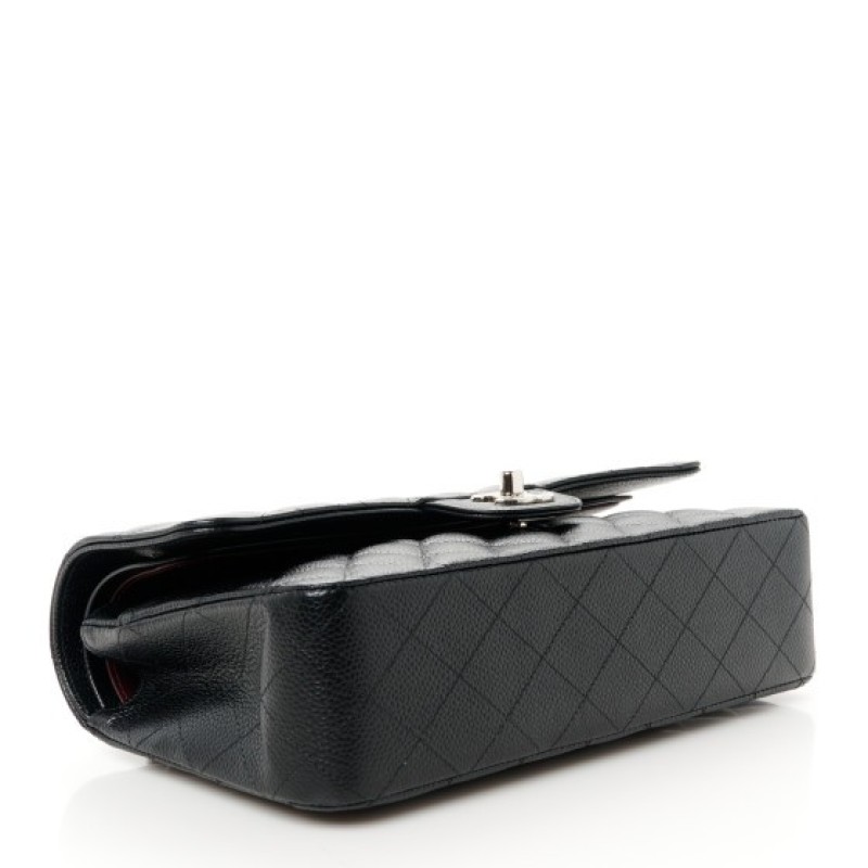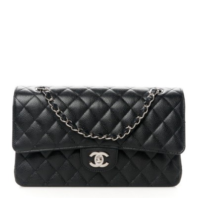 This is an authentic CHANEL Caviar Quilted Medium Double Flap in Black. This elegant shoulder bag is crafted of luxurious caviar textured leather in black. The bag features a leather threaded silver chain-link shoulder strap, a rear patch pocket, and a crossover flap with a silver classic CC turn lock. The flap opens to reveal an inner flap and a black leather interior with patch pockets.