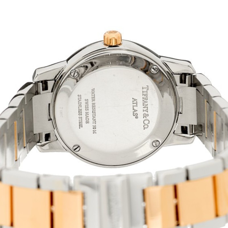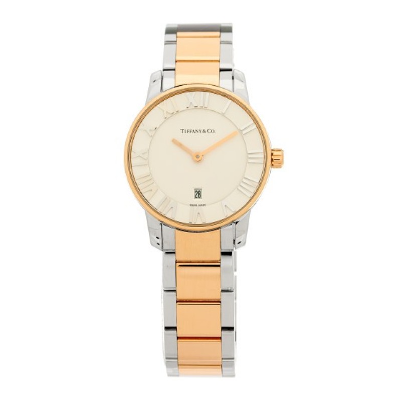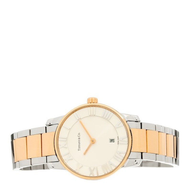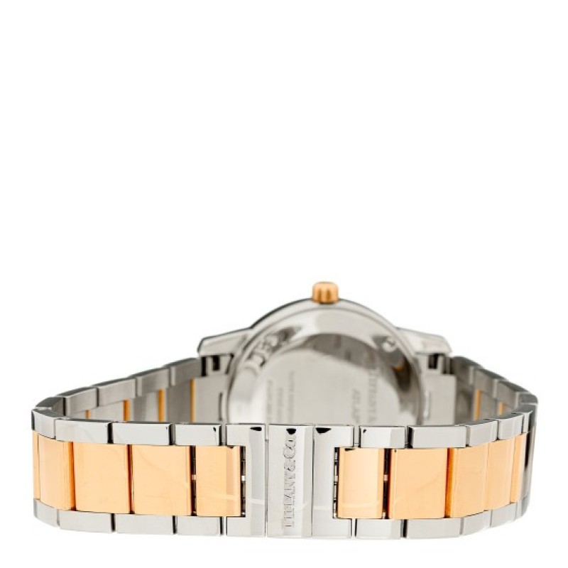This is an authentic TIFFANY Stainless Steel 18K Rose Gold 29mm Atlas 2-Hand Quartz Watch. This watch is crafted of stainless steel and 18 karat rose gold and features a white dial with Roman numeral hour markers, sapphire crystal, and a quartz movement.