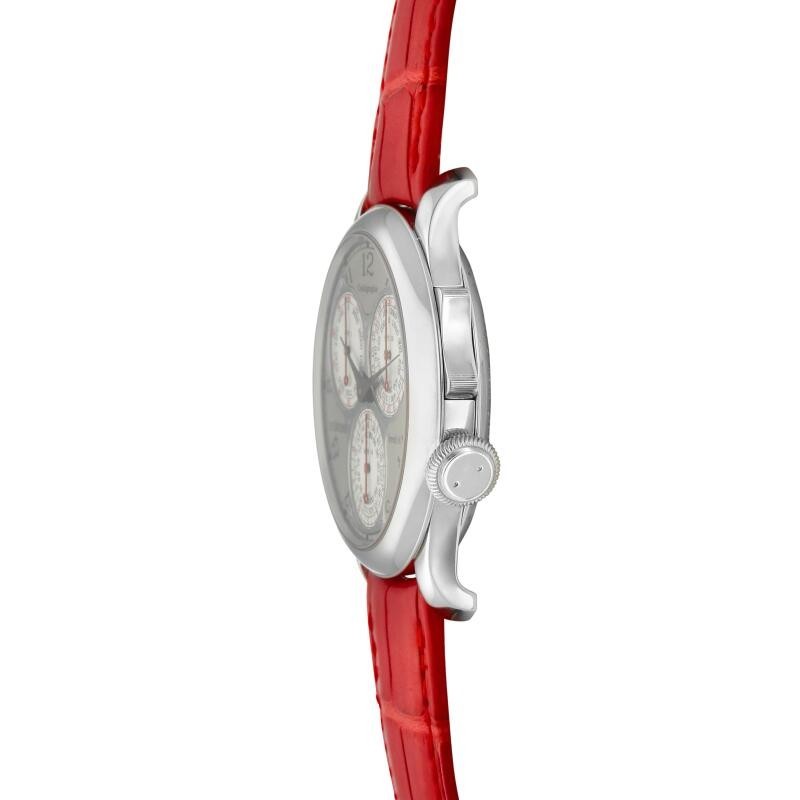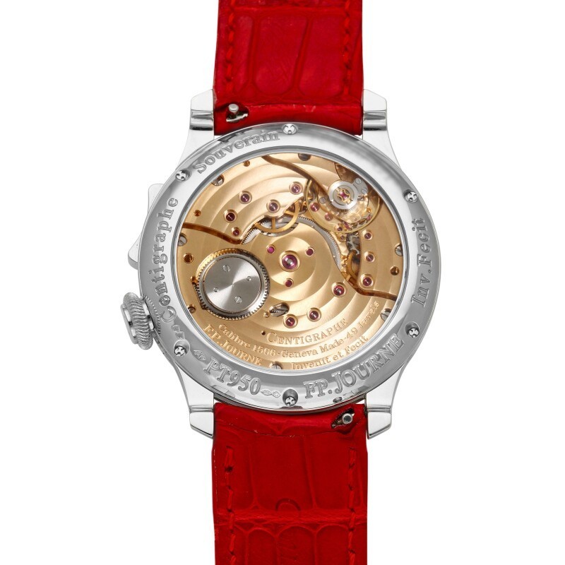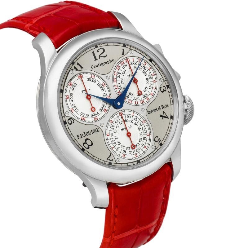 An instantly recognizable feature of the Centigraphe collection is its distinctive three-register chronograph dial—the first hand-wound wristwatch capable of measuring elapsed times from 100th of a second to 10 minutes. F. P. Journe's ingenious movement design separates the chronograph complication from the timekeeping mechanism, ensuring utmost accuracy while the chronograph is in operation. Unlike conventional watches, the chronograph can be activated using an ergonomic rocker arm system, minimizing energy loss and maintaining precision upon activation. Encased in an elegant platinum case with a white gold dial, the Centigraphe is a standout collector's piece, destined to be cherished for years to come.