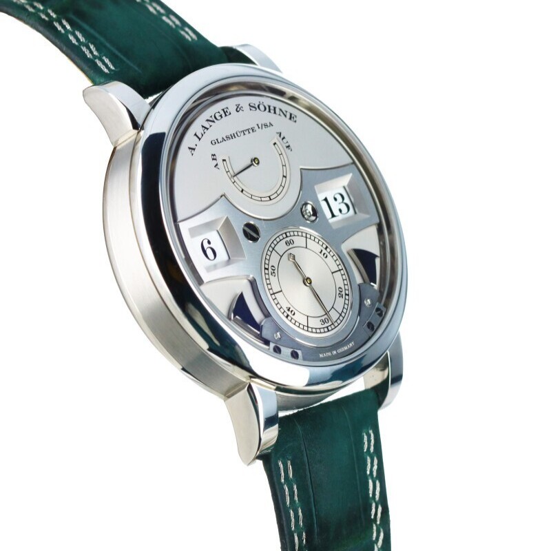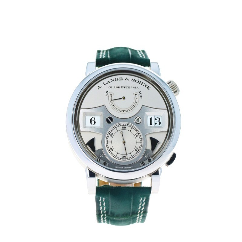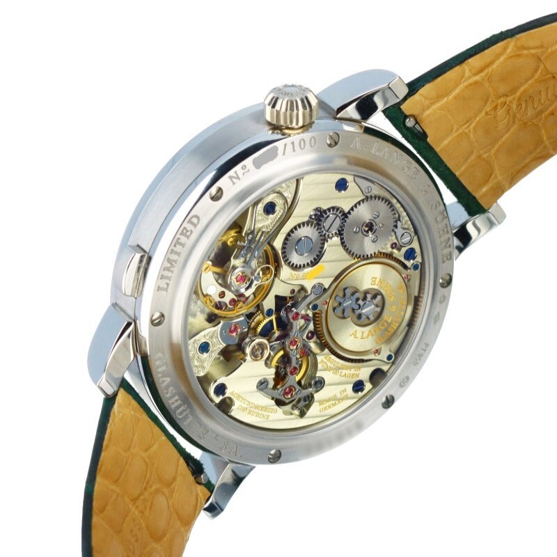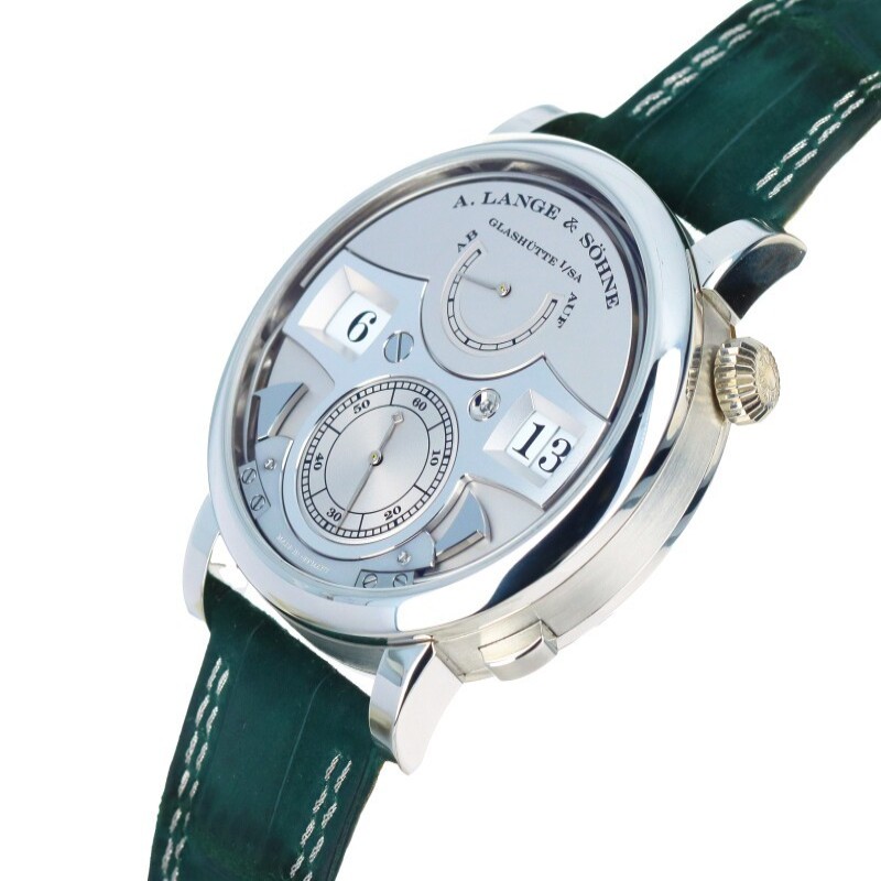 Includes A. Lange & Söhne box and papers, offered on a bespoke Jean Rousseau green leather strap.