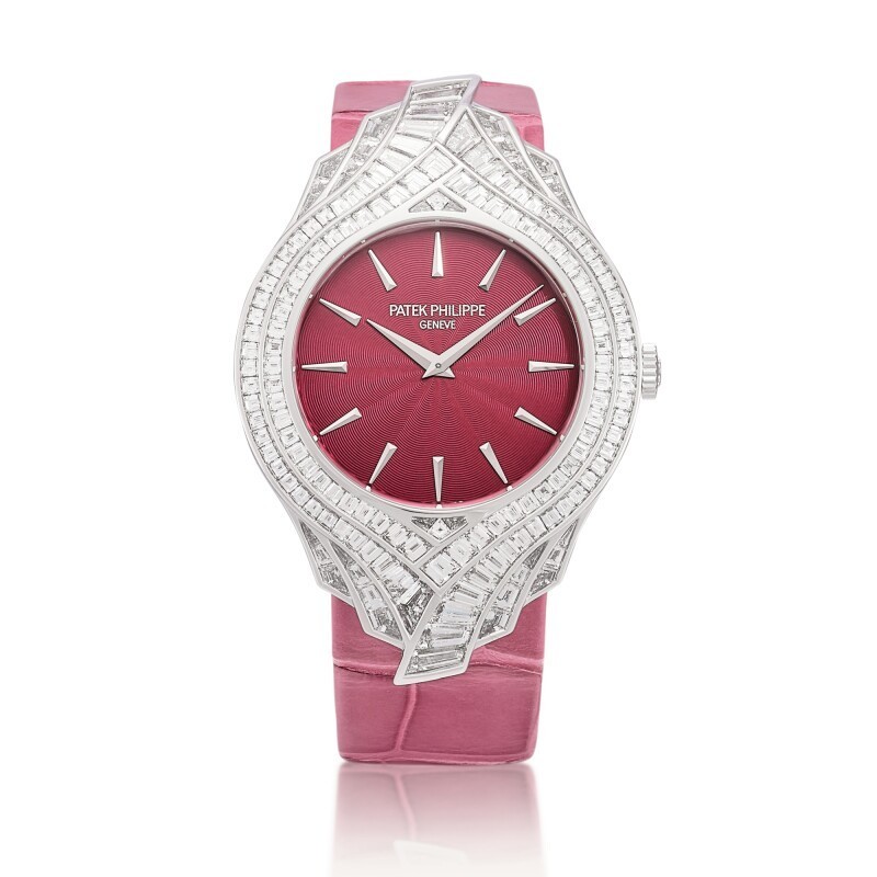 The present Calatrava Haute Joaillerie Reference 4895 is a breathtaking fusion of horological excellence and high jewelry artistry. The 162 baguette diamonds, weighing approximately 5.62 carats, are elegantly arranged around the dial in up to five rows, with flared ends extending gracefully over the strap. This intricate setting demands exceptional precision, as the diamonds must be internally flawless, exhibit Top Wesselton fine white brilliance, and be perfectly matched in size, shape, and cut to achieve a harmonious composition.