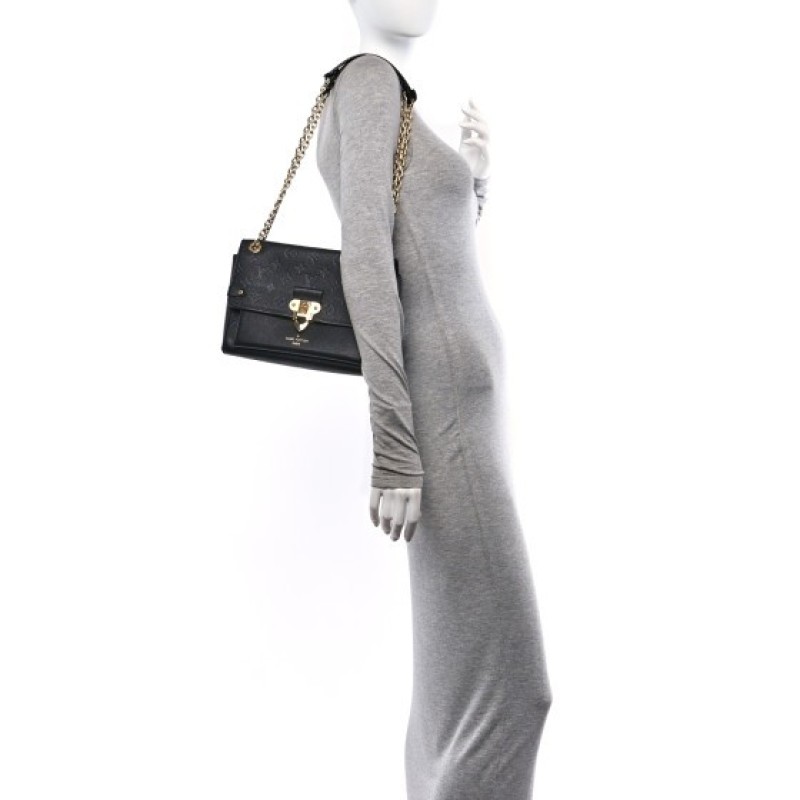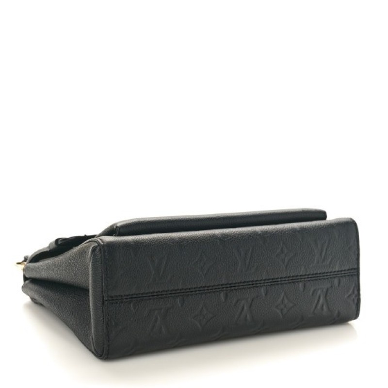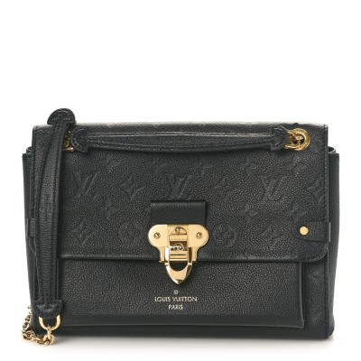 This is an authentic LOUIS VUITTON Empreinte Vavin PM in Black. This shoulder bag is crafted of Louis Vuitton monogram embossed leather in black. It features brass bijoux chain link shoulder straps with leather shoulder pads, a crossover flap, and a polished gold magnetic closure. The flap opens to a black microfiber interior with a zippered compartment and front pocket.