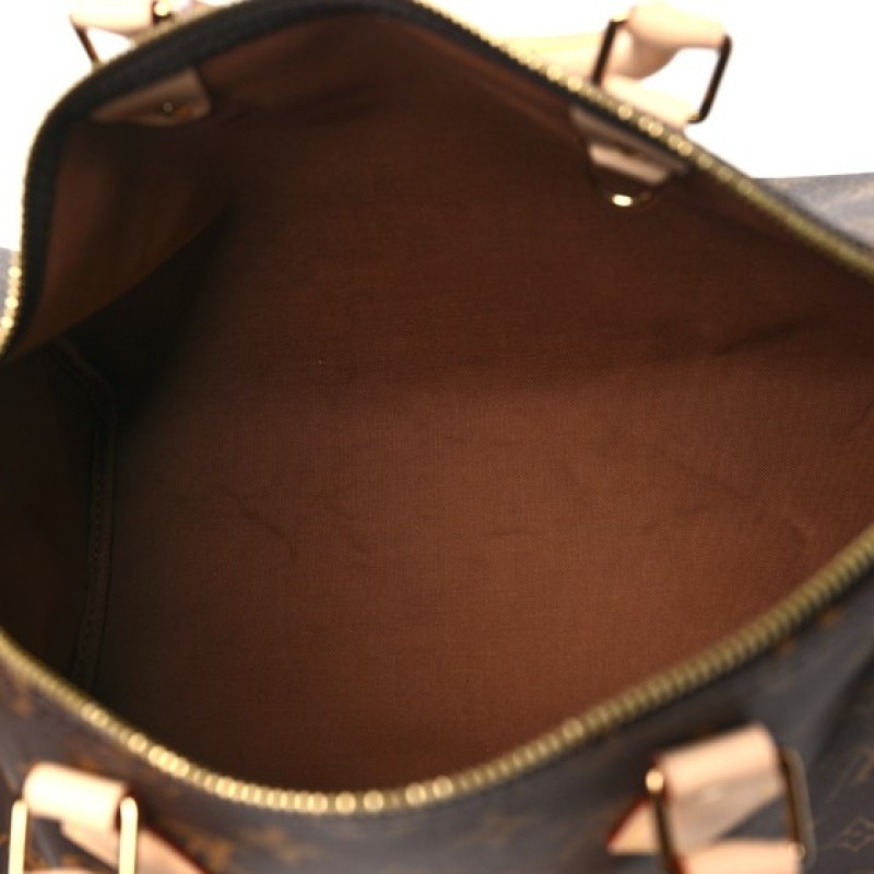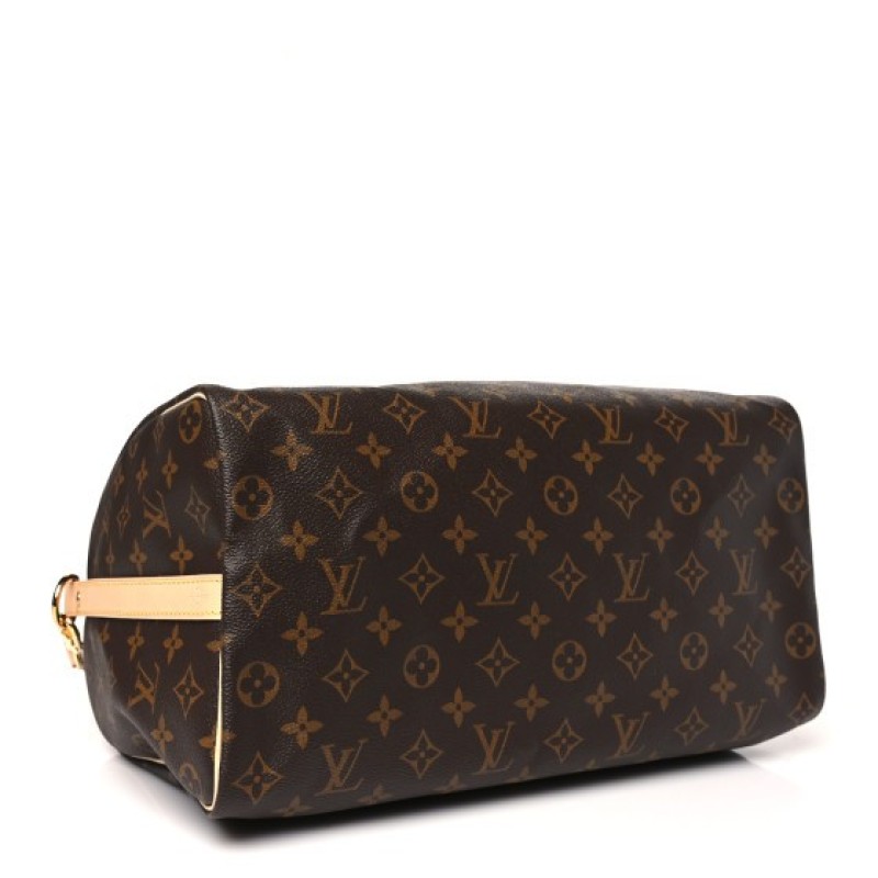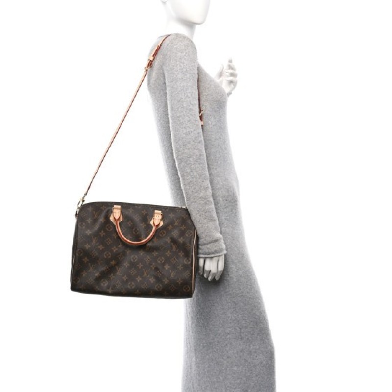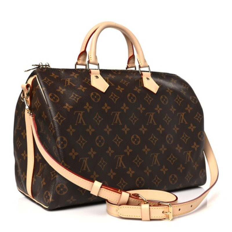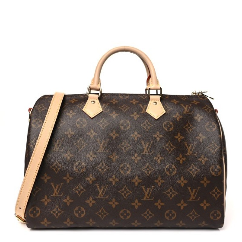 This is an authentic LOUIS VUITTON Monogram Speedy Bandouliere 35. This stylish handbag is finely crafted of signature Louis Vuitton monogram toile canvas. This shoulder bag features vachetta cowhide leather rolled top handles, an optional adjustable shoulder strap, and polished brass hardware. The top zipper opens to a cocoa brown fabric interior with a hanging pocket.
