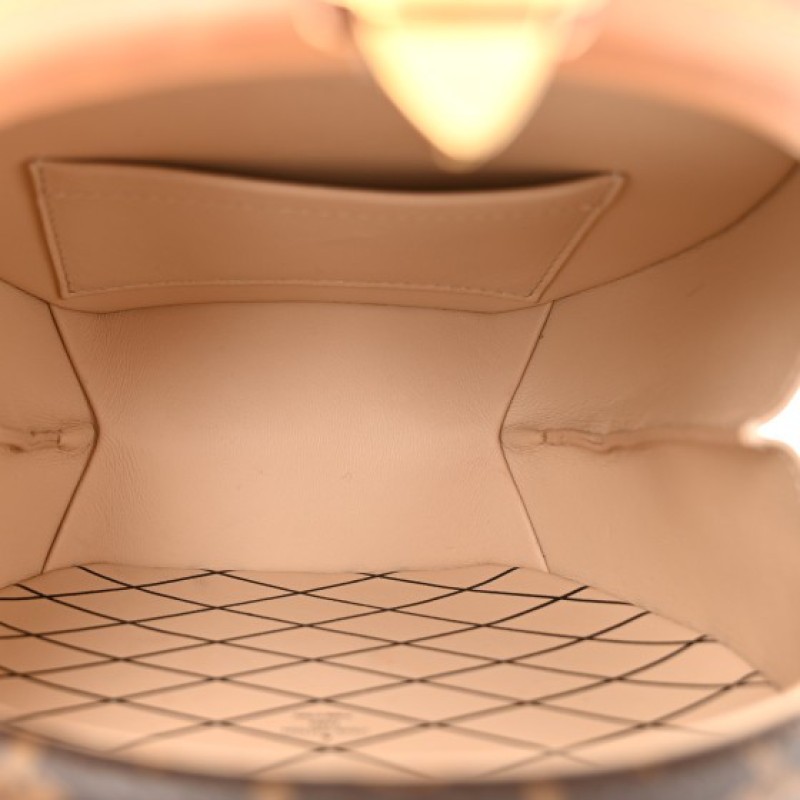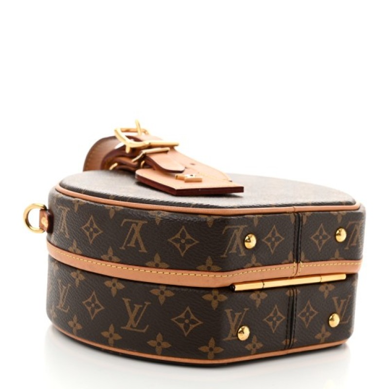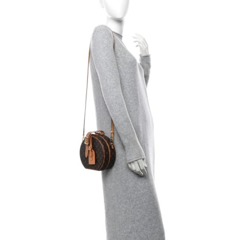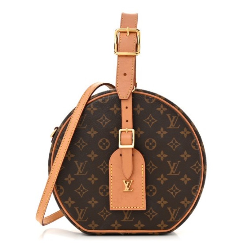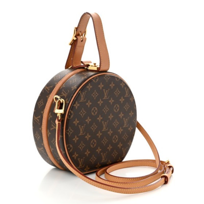 This is an authentic LOUIS VUITTON Monogram Petite Boite Chapeau. This hat box inspired bag is crafted of a sturdy Louis Vuitton monogram on coated canvas. The bag features a vachetta cowhide strap handle with a lock closure. This opens to a beige leather interior with a flat pocket.