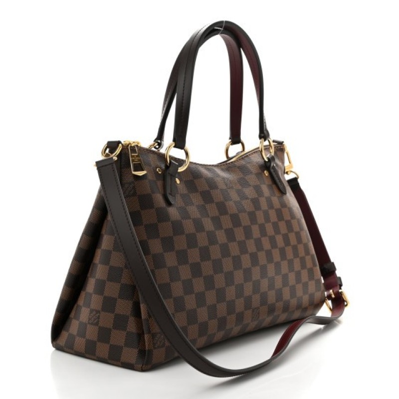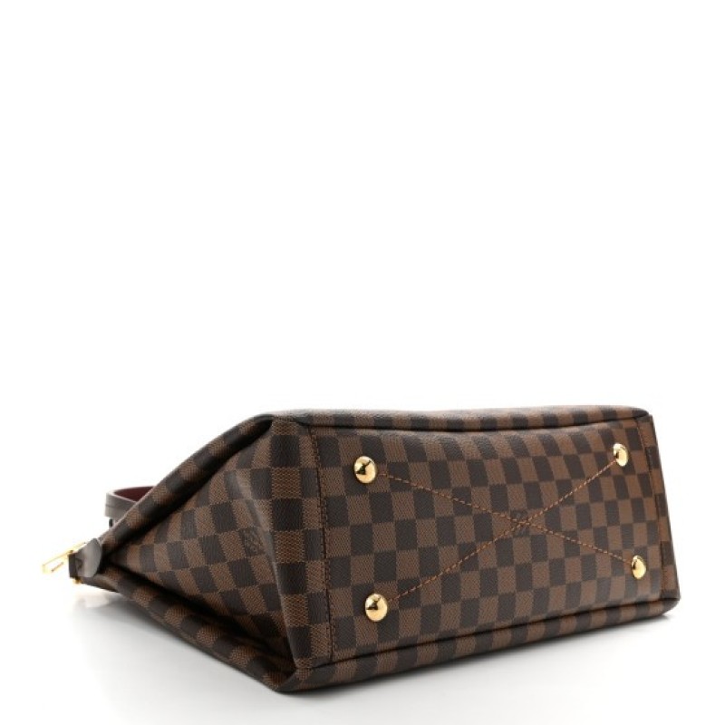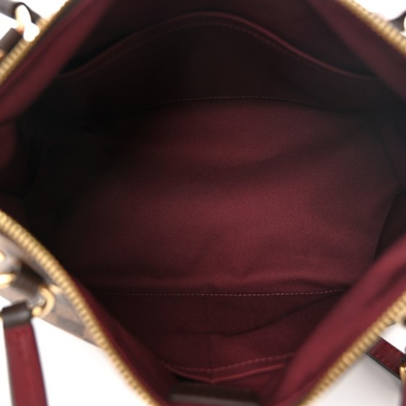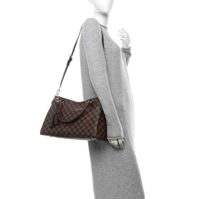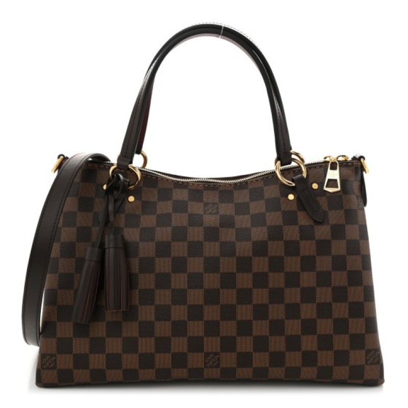 This is an authentic LOUIS VUITTON Damier Ebene Lymington. This sophisticated handbag is crafted of Louis Vuitton's checkerboard coated canvas in brown. The bag features leather top straps, an optional adjustable shoulder strap, removable tassels, and polished brass hardware. The gold top zippers open to a burgundy fabric interior with patch pockets.