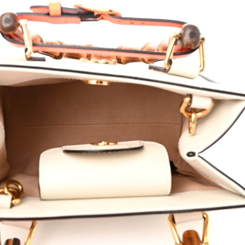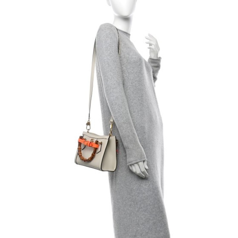 This is an authentic GUCCI Wonka Grain Calfskin Mini Diana Tote Bag in Mystic White and Orange Fluo. This versatile bag is crafted of white calfskin leather with bamboo top handles and bright orange leather belt handle shapers. The bag features a removable, adjustable white leather shoulder strap and gold hardware, including aged gold GG logo on the front. The magnetic top snap opens to a beige microfiber interior.
