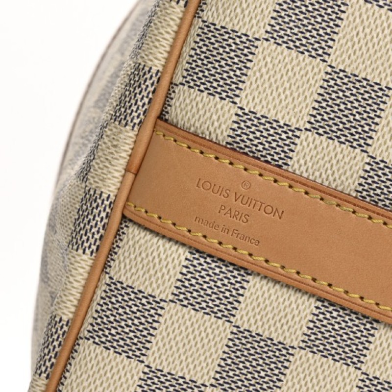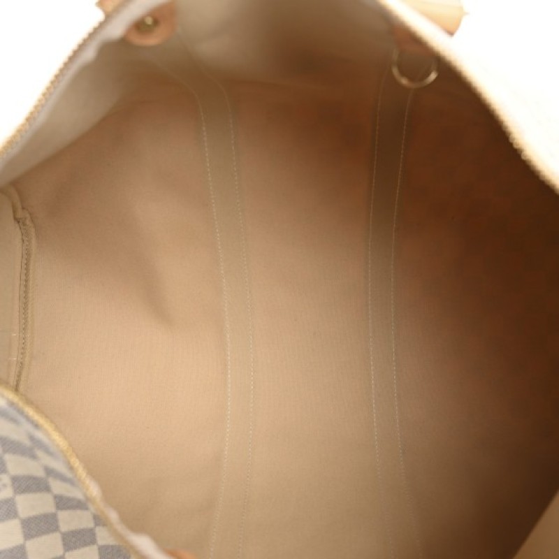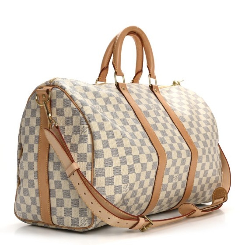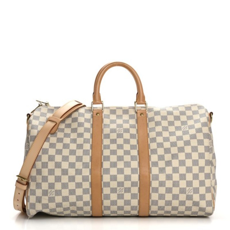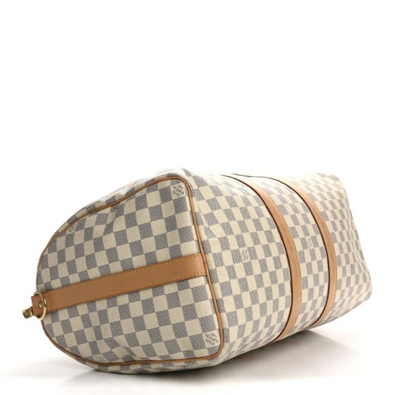 This is an authentic LOUIS VUITTON Damier Azur Keepall Bandouliere 45. This spacious duffel bag is crafted of Louis Vuitton checkerboard canvas in blue and white. The bag features vachetta cowhide leather trim, rolled top handles and brass hardware. The top zippers open to a beige fabric interior.