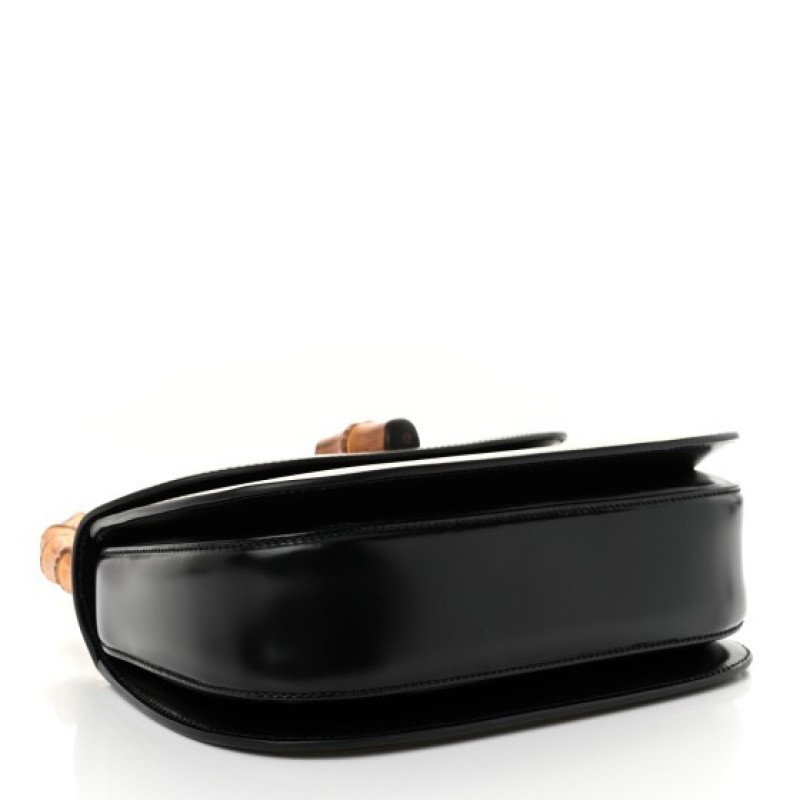 This is an authentic GUCCI Calfskin Frame Print Bamboo Top Handle Bag in Black. This chic bag is crafted of calfskin leather in black. The bag has a sturdy looping bamboo top handle, black leather shoulder strap, gold detailing along the trim, aged gold hardware and a bamboo turn lock for the frontal flap. This opens to a floral fabric interior with a zipper and patch pocket.