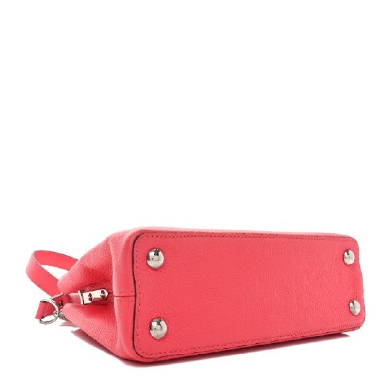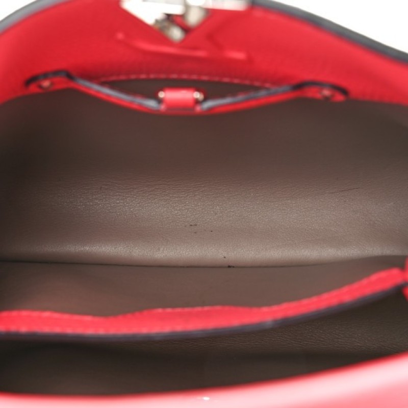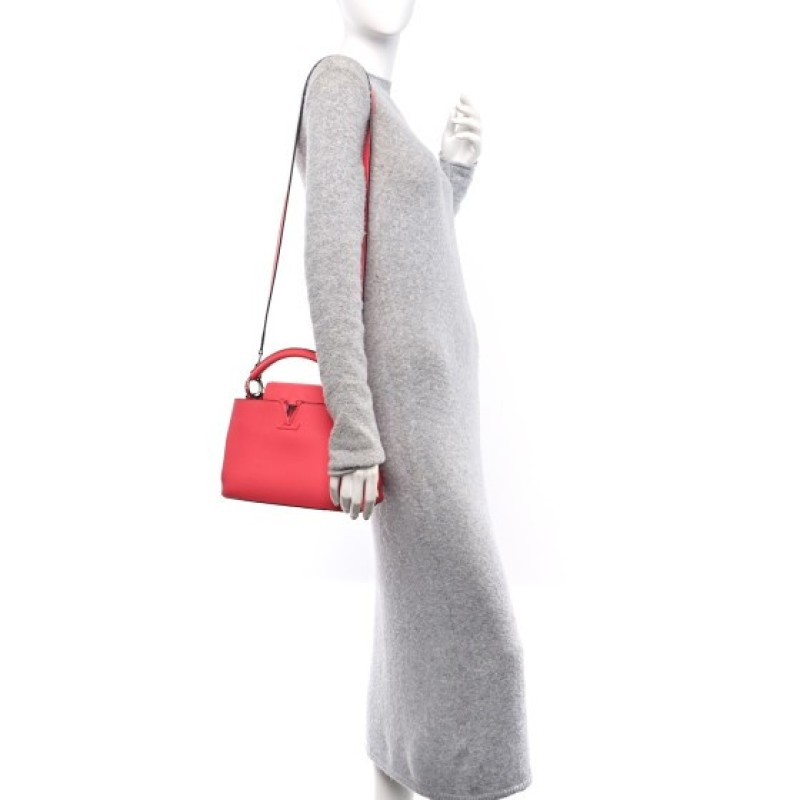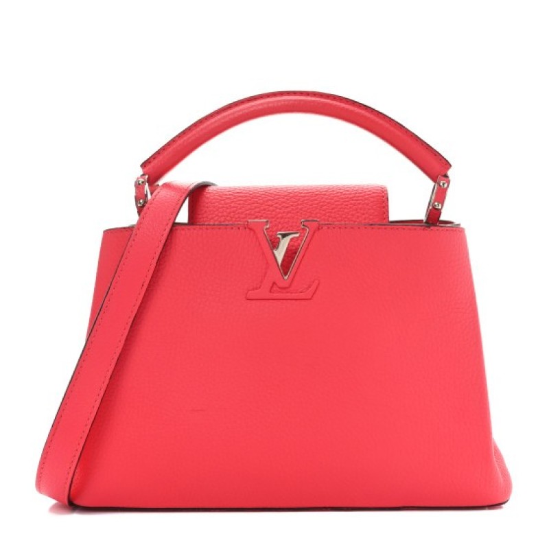 This is an authentic LOUIS VUITTON Taurillon Capucines BB in Rose Litchi. This handbag is crafted of textured taurillon calfskin leather in coral pink. The bag features a looping rolled leather top handle with silver ring links, and an optional shoulder strap. The crossover flap opens to a partitioned taupe leather interior with a zipper pocket.