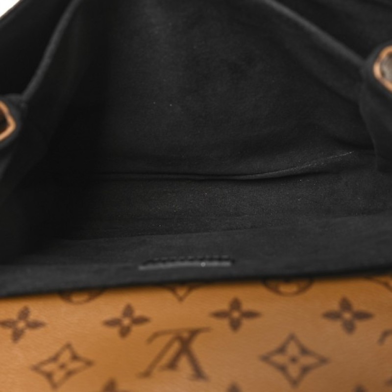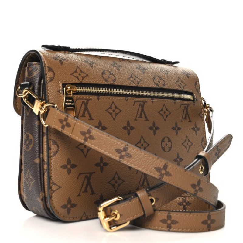 This is an authentic LOUIS VUITTON Reverse Monogram Pochette Metis. This handbag is crafted of classic and reverse Louis Vuitton monogram on coated canvas in brown and beige. The bag features a rear zipper pocket, a black leather top handle, and a removable adjustable reverse monogram canvas shoulder strap. The crossover flap opens with a polished gold-toned S-lock to a partitioned black microfiber interior.