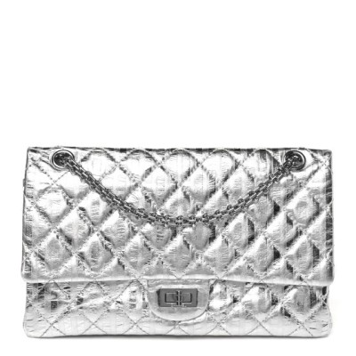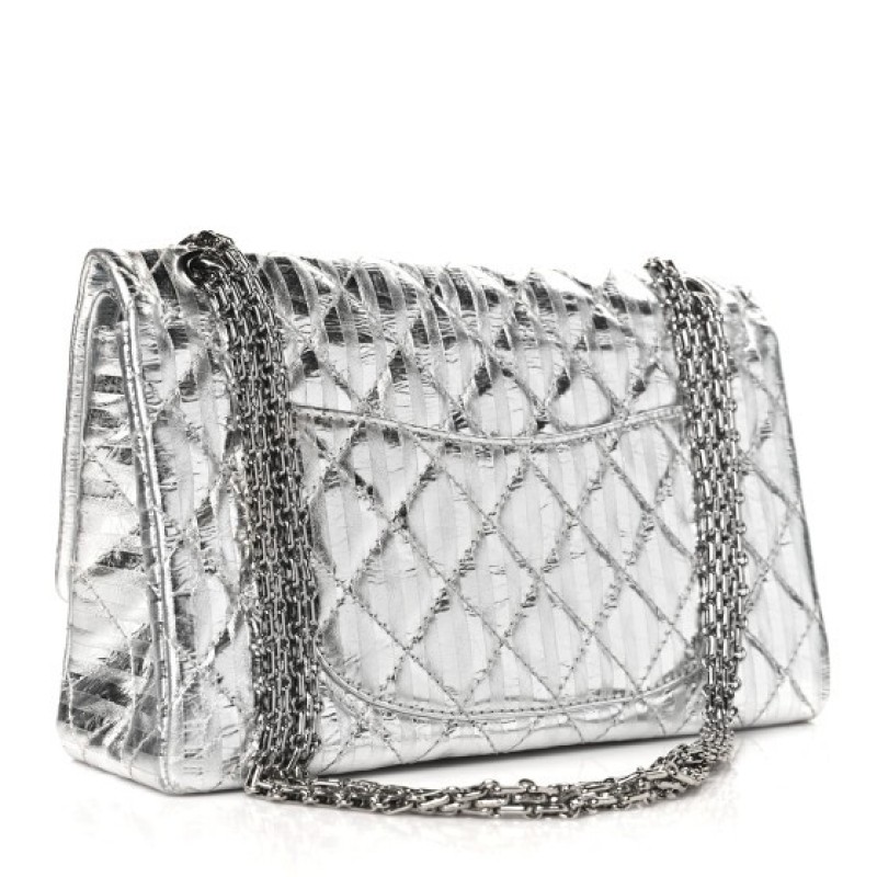 This is an authentic CHANEL Metallic Striped Calfskin 2.55 Reissue 226 Flap in Silver. This stylish shoulder bag is beautifully crafted of diamond quilted metallic aged calfskin leather in silver. The bag features bijoux silver chain shoulder straps with a frontal squared silver Mademoiselle turn lock. This opens the frontal semi-full flap to a matte leather interior with patch pockets.