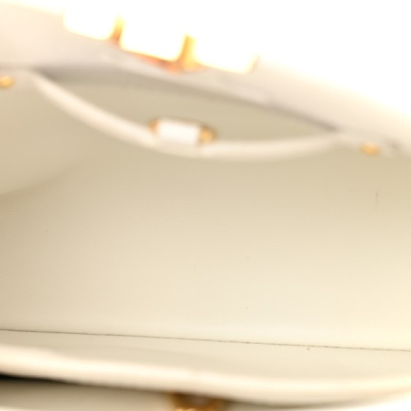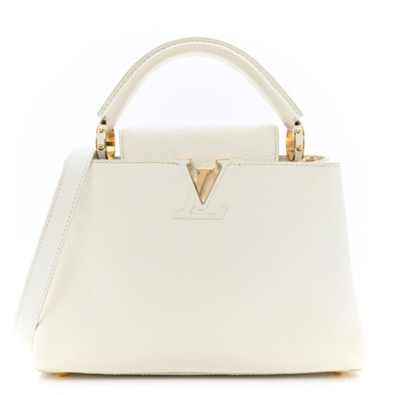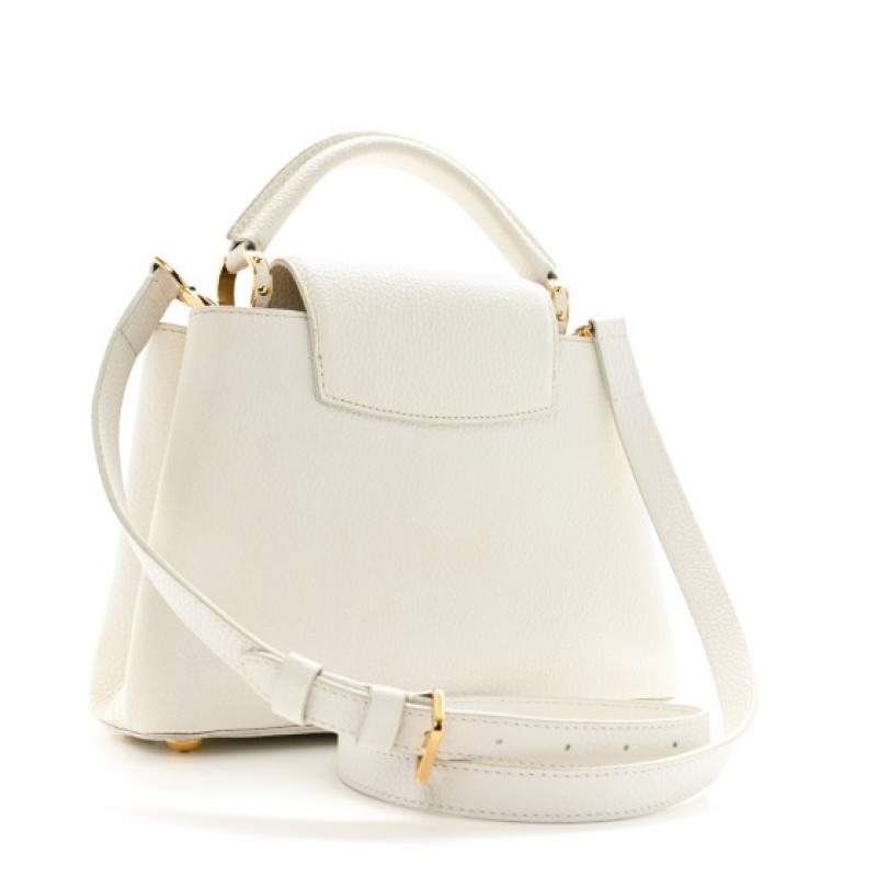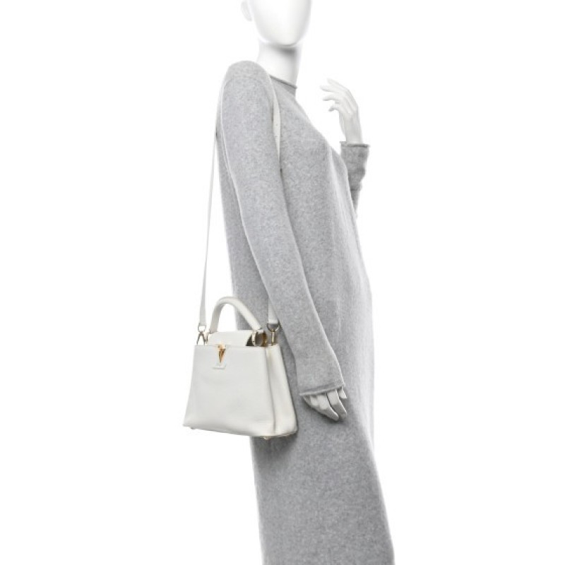 This is an authentic LOUIS VUITTON Taurillon Capucines BB in Blanc Casse. This stylish handbag tote is crafted of beautifully textured taurillon calfskin leather in white. This bag features a reinforced looping rolled leather top handle with gold hardware and an optional leather shoulder strap. The top opens to a matching partitioned leather interior with a zipper pocket.