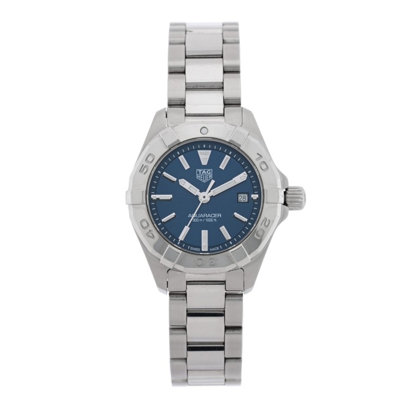This is an authentic TAG HEUER Stainless Steel 27mm Aquaracer Lady Quartz Watch Blue WBD1412. This watch is crafted of stainless steel and features a blue dial, luminous hands and hour markers, sapphire crystal, and a quartz movement.