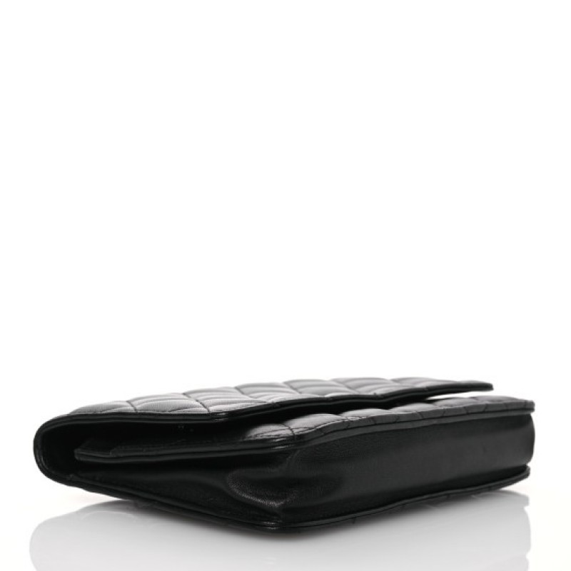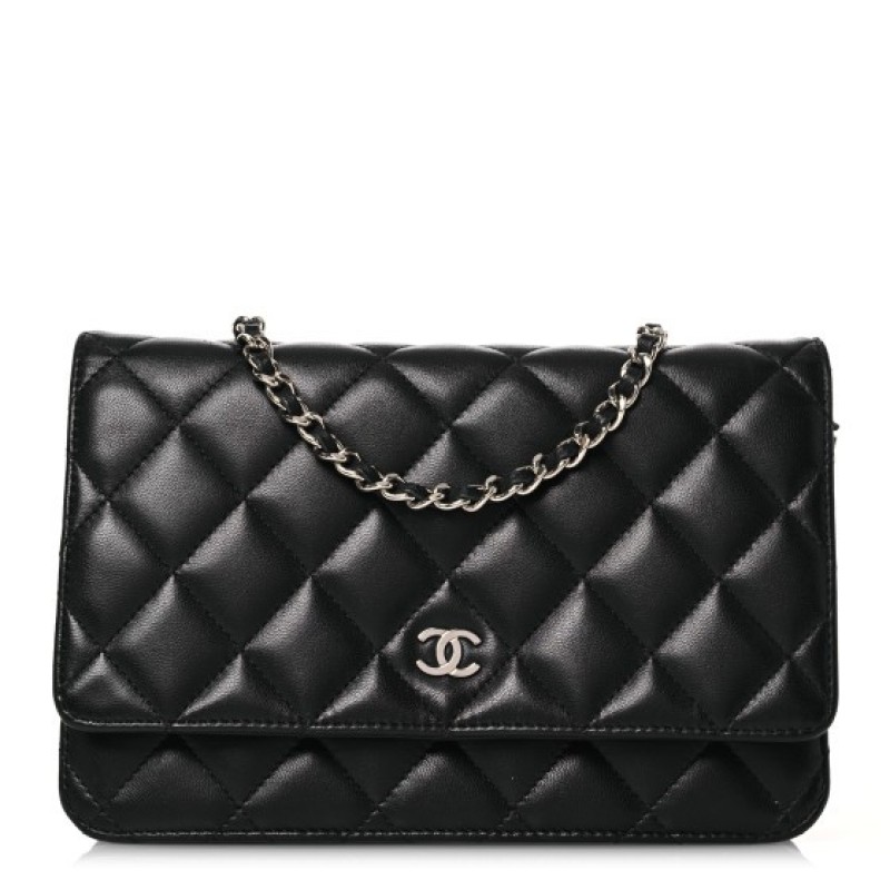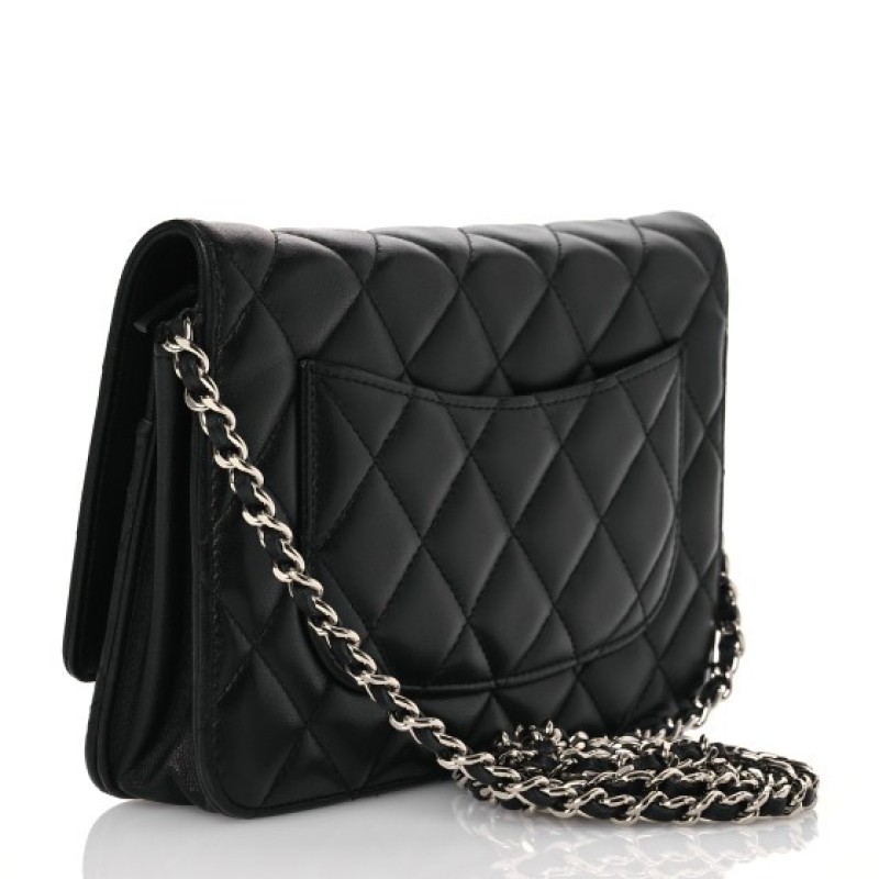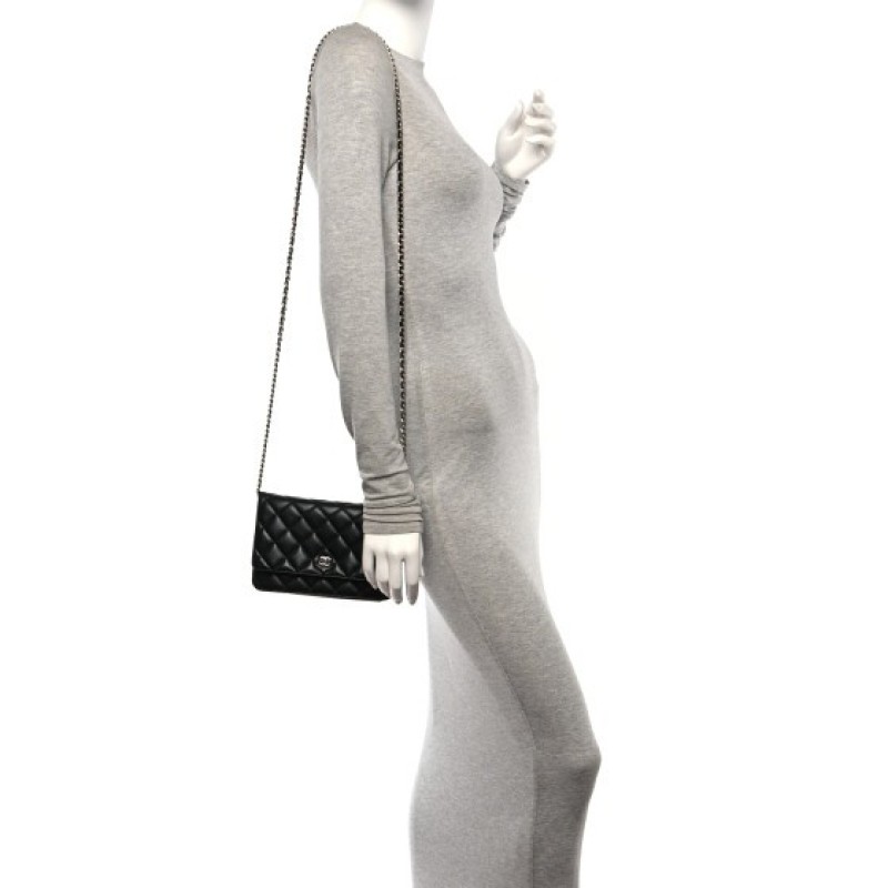 This is an authentic CHANEL Lambskin Quilted Wallet On Chain WOC in Black. This wallet is crafted of textured diamond quilted lambskin leather in black. This shoulder bag features a polished gold chain-link crossbody strap and a Chanel CC logo on the facing flap. The bag opens to a burgundy fabric interior with a zipper compartment, card slots, and a leather patch pocket.