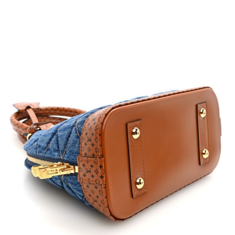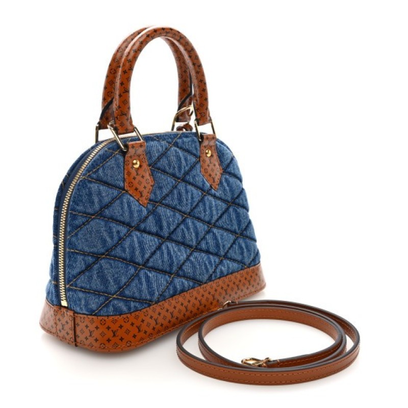 This is an authentic LOUIS VUITTON Denim Calfskin Reverse Monogram Malletage Alma BB in Blue. This exceptional tote is beautifully crafted of blue diamond quilted denim with mini monogram calfskin leather trim. The bag features smooth brown monogrammed leather trim, rolled top handles, and an optional shoulder strap with gold hardware.
