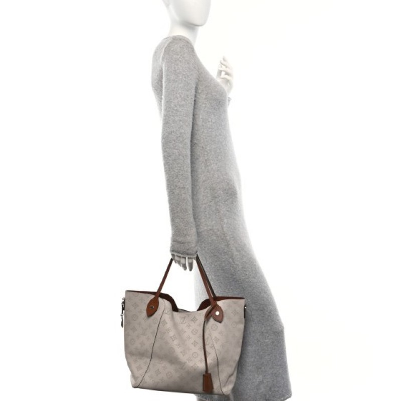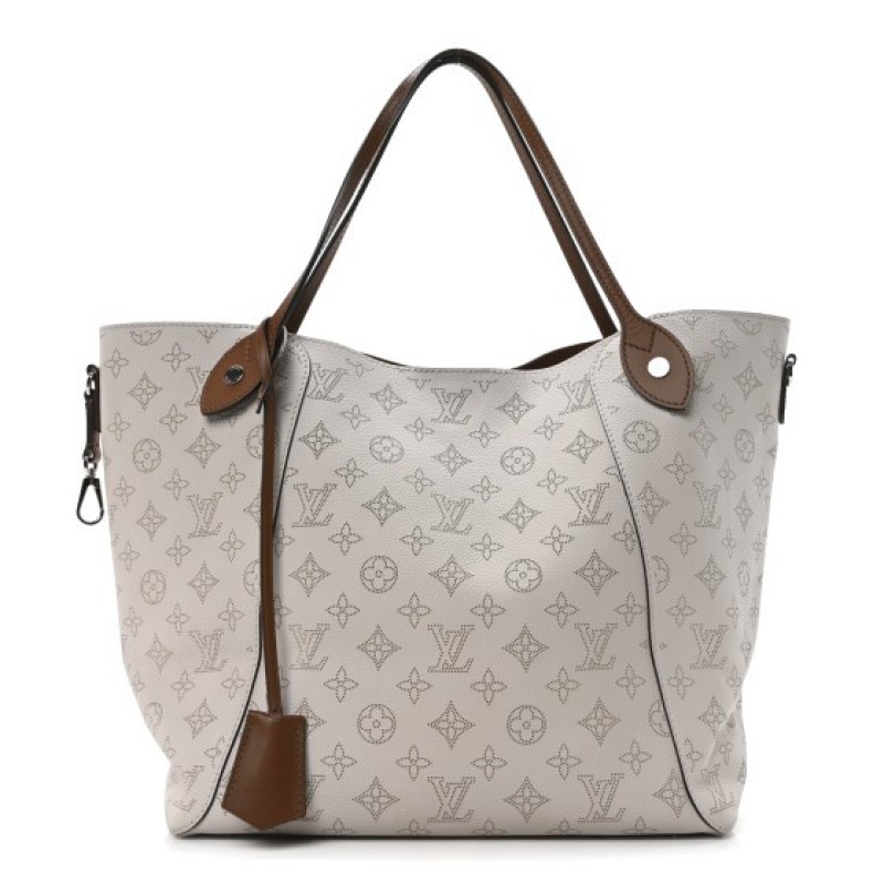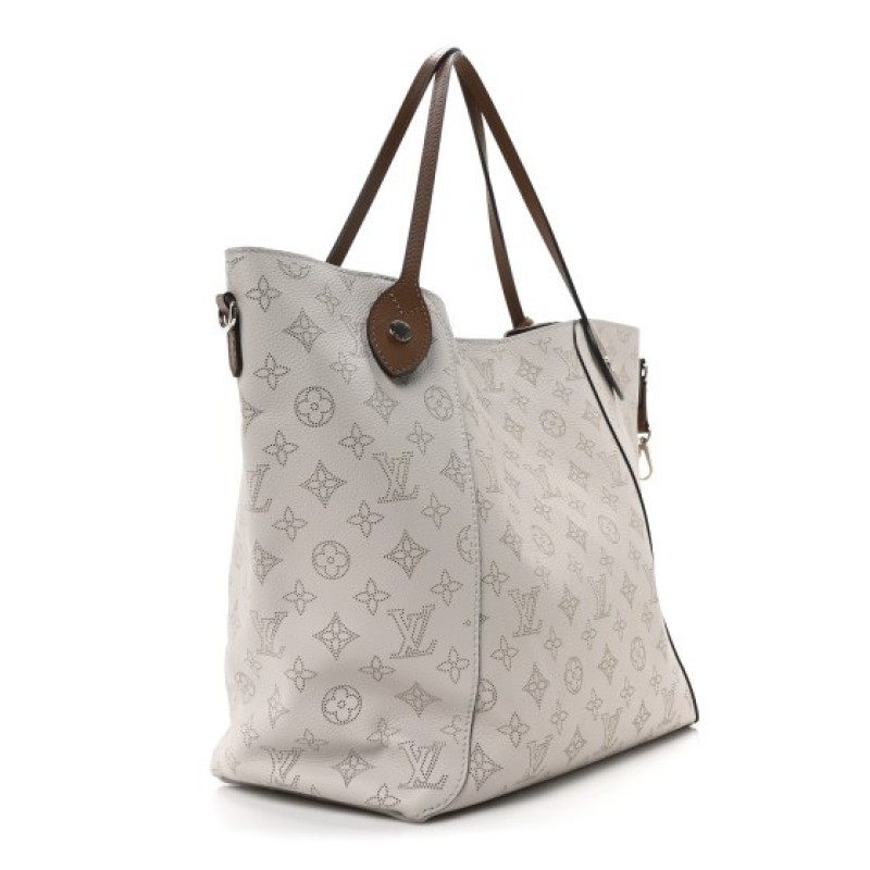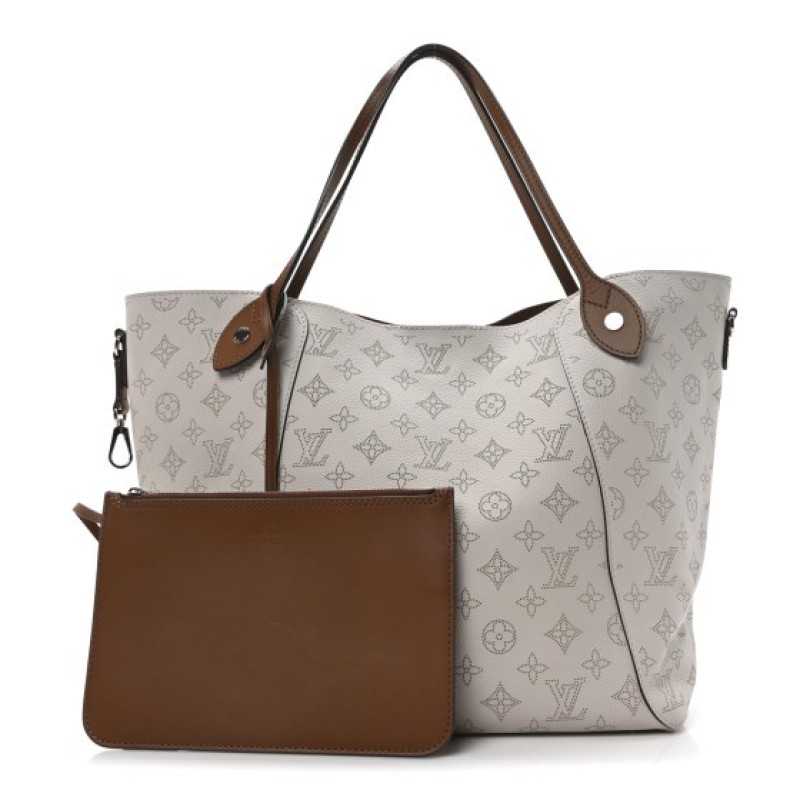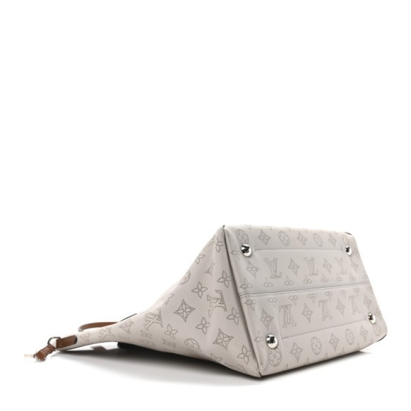 This is an authentic LOUIS VUITTON Mahina Hina MM in Galet. This stylish tote is crafted of classic Louis Vuitton monogram on taupe perforated mahina leather. The bag features leather trim, and top handles with polished silver hardware. The top is open to a matching brown perforated suede interior and a leather pochette.