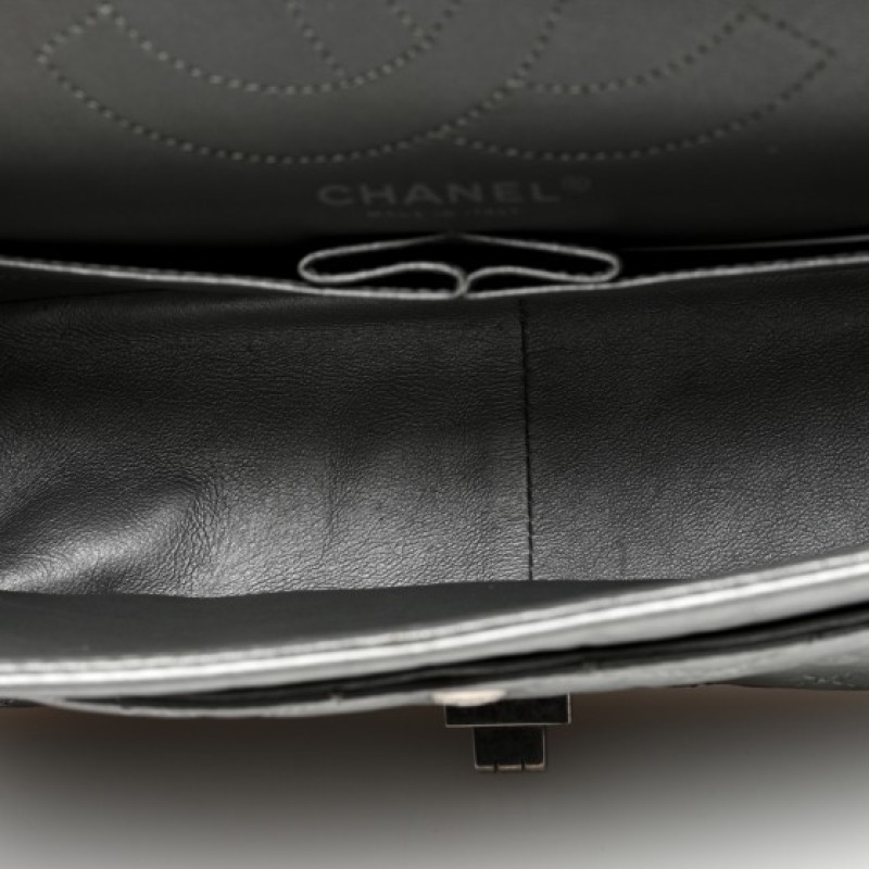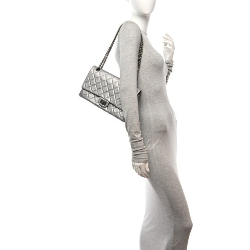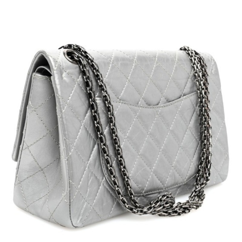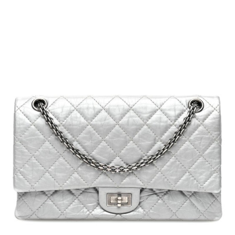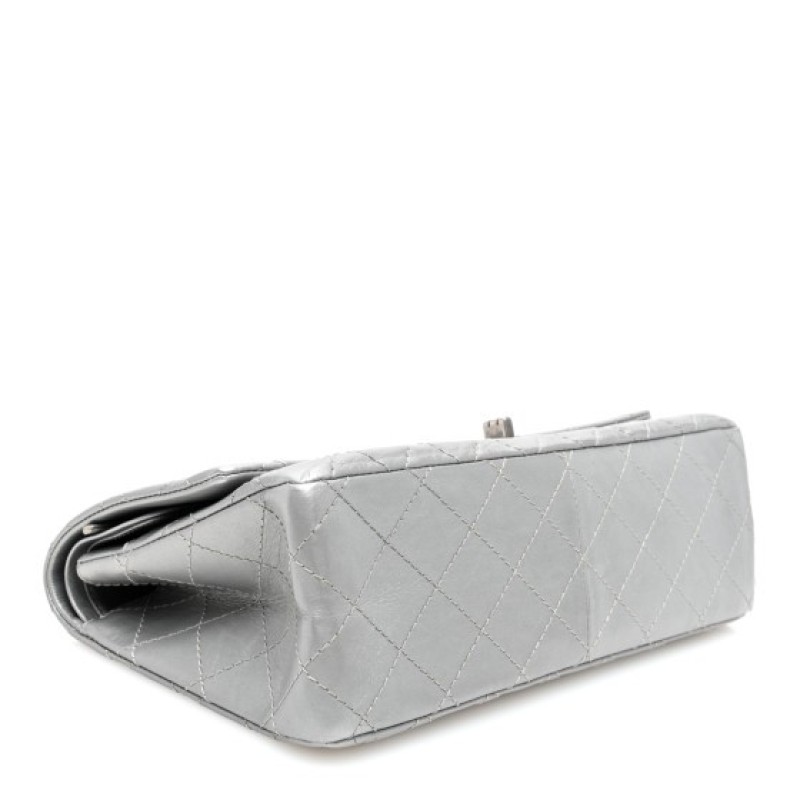 This is an authentic CHANEL Metallic Aged Calfskin Quilted 2.55 Reissue 226 Flap in Silver. This elegant shoulder bag is beautifully crafted of diamond quilted aged and distressed calfskin leather in silver. The bag features aged silver bijoux chain shoulder straps and matching mademoiselle turn lock. This opens to an inner flap and leather interior with patch pockets.