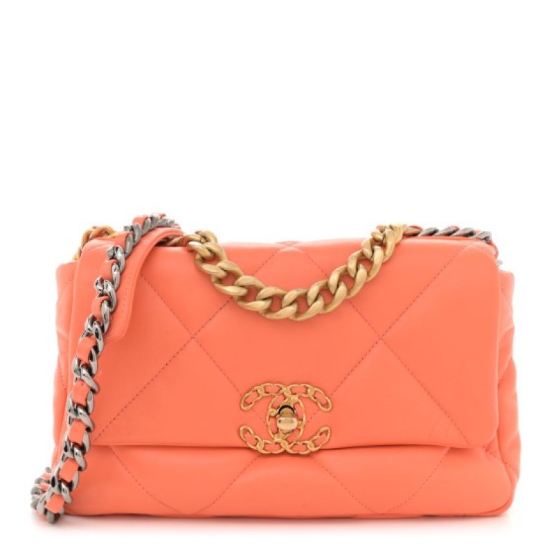 This is an authentic CHANEL Lambskin Quilted Medium Chanel 19 Flap in Orange. This pillowy soft shoulder bag is crafted of oversized quilted lambskin leather in orange. The bag features a gold chain detail CC turn-lock on the flap, a magnetic snap pocket at the rear, and a leather threaded aged gold, ruthenium, and dark silver chain-link shoulder strap with a leather shoulder pad. The front flap opens to a matching fabric interior with a zipper pocket.