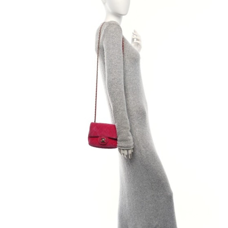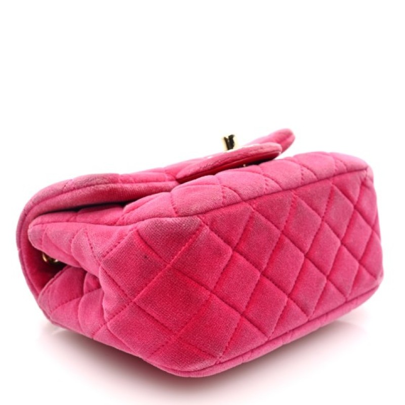 This is an authentic CHANEL Velvet Quilted Mini Square Pearl Crush Flap in Fuchsia. This chic crossbody flap bag is crafted of soft diamond-quilted velvet in pink. The bag features a rear patch pocket, a gold chain-link shoulder strap threaded, and a velvet that has a round, crystal-embellished gold cinch adjustment. The front flap secures with a gold CC logo turn lock and opens to a matching fabric interior with zipper and patch pockets.