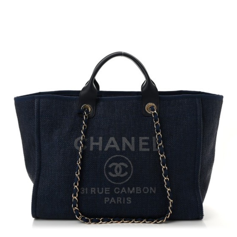 This is an authentic CHANEL Woven Straw Raffia Medium Deauville Tote in Navy This stylish handbag is crafted of fine woven straw raffia in dark blue with a light blue embroidered Chanel Rue Cambon Paris logo on the front. The bag features navy rolled leather top handles, navy grosgrain fabric top trim, and fabric threaded gold chain shoulder straps. The top is open to a navy blue fabric interior with zipper and patch pockets.