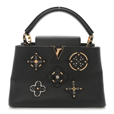 This is an authentic LOUIS VUITTON Taurillon Metallic Flowers Capucines PM in Black. This beautiful handbag is crafted of luxurious textured calf leather in black with iconic Louis Vuitton leather flowers and gold studs. The handbag features a single rolled leather reinforced top handle with stylized links and a crossover flap that inserts behind the prominent black and gold LV logo. This bag opens to a partitioned black leather interior with a zipper pocket, flat pocket, and a D-ring clasp.