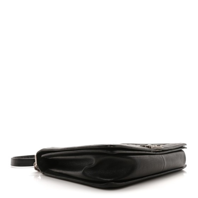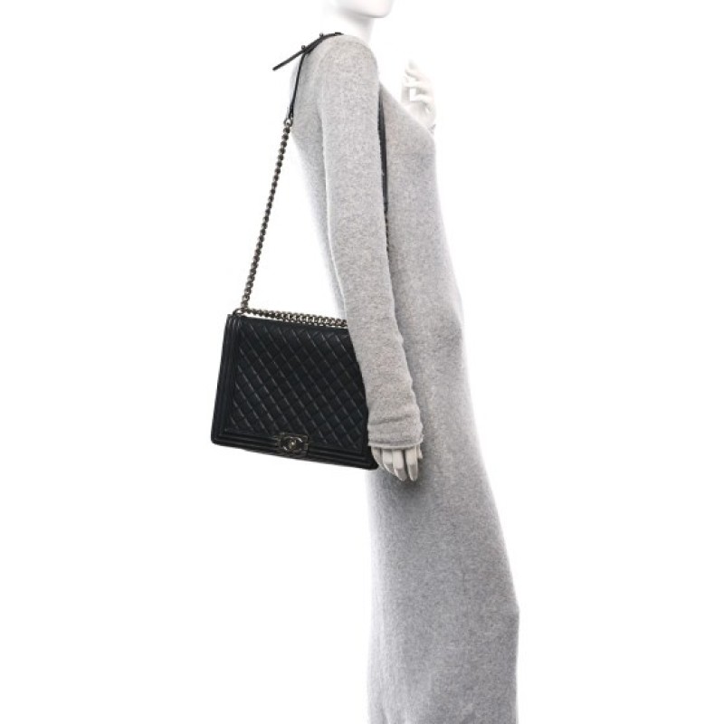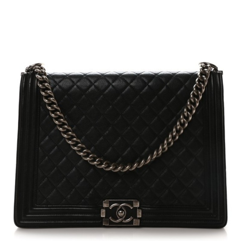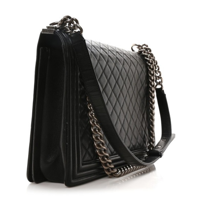 This is an authentic CHANEL Caviar Quilted Large Boy Flap in Black. This bag is crafted of black caviar quilted leather and ruthenium hardware. The flap opens to a black fabric interior with a zipper pocket and patch pockets.