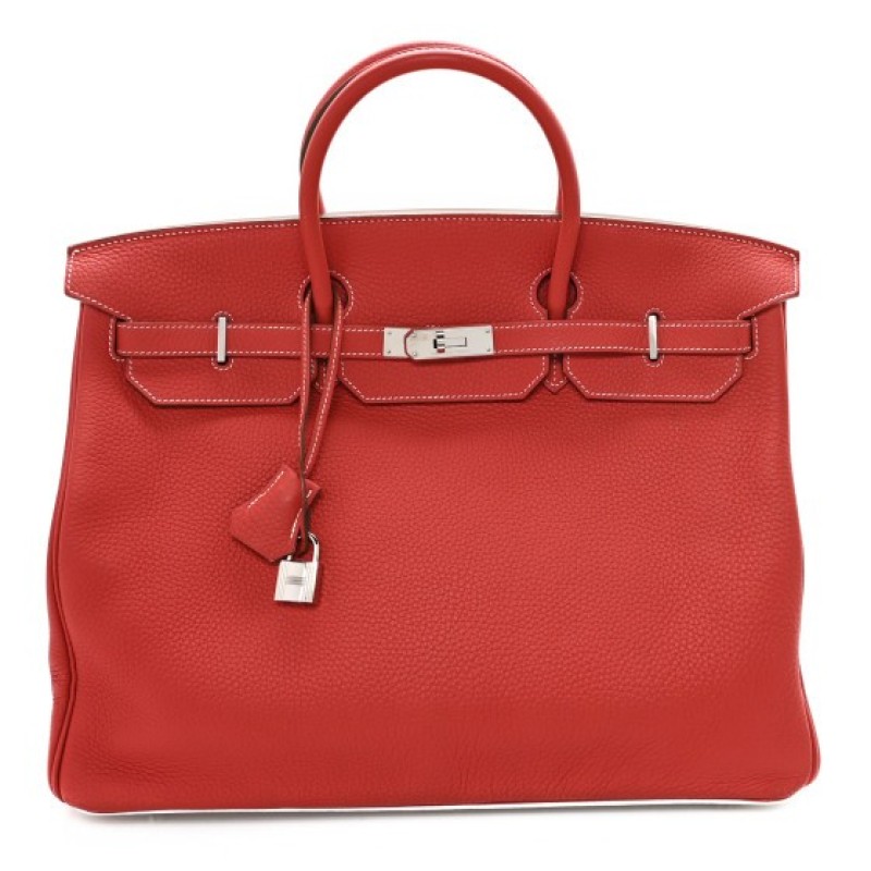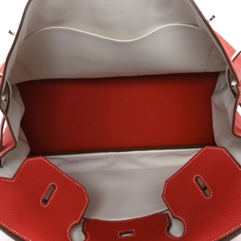 This is an authentic HERMES Togo Casaque Birkin 40 in Sanguine and White. This stylish tote is beautifully crafted of togo calfskin leather in coral red and white. The bag features rolled leather top handles, a frontal flap and strap closure, and palladium silver hardware including strap links and a front turn lock with a padlock and a matching clochette for the key. This opens the top flap to a white chevre goatskin leather interior with pockets.