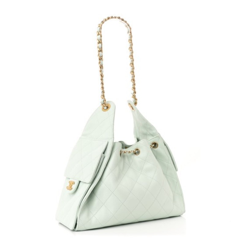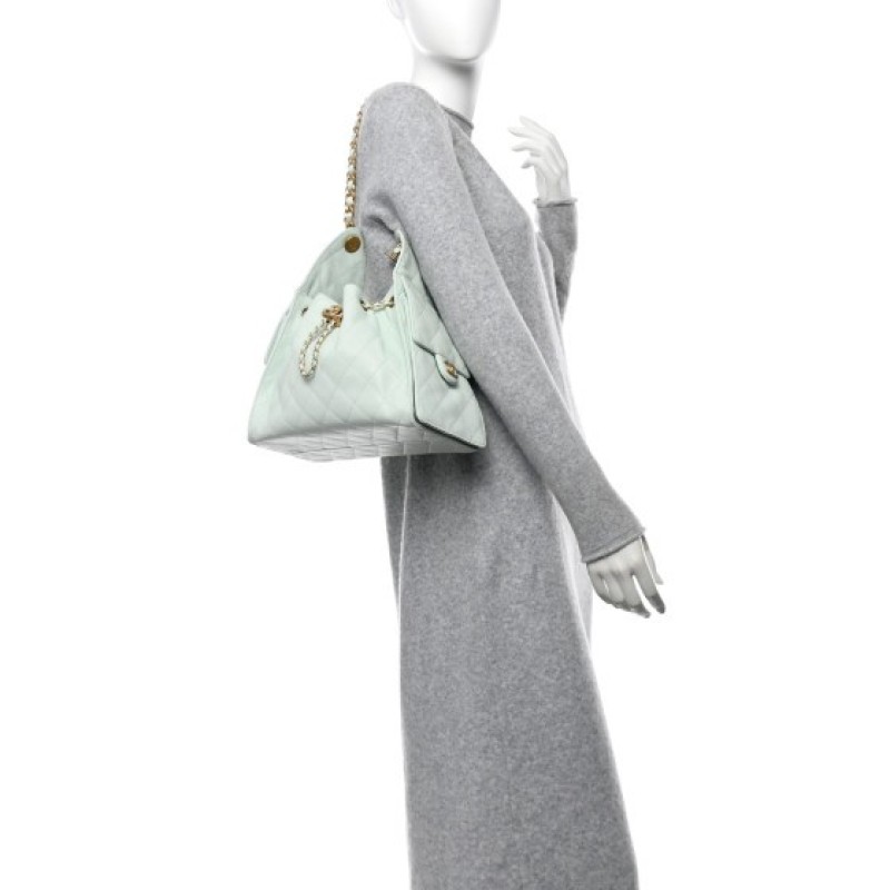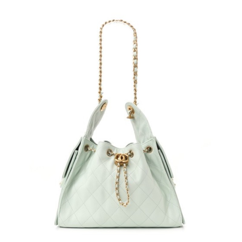 This is an authentic Chanel Caviar Quilted Small Chanel 25 Handbag in Light Green. This chic shoulder bag is crafted of mint green, diamond-stitched caviar leather. It features a gold chain leather threaded shoulder strap, two side pockets with CC logos, and an adjustable drawstring closure that opens to a fabric interior with patch pockets.