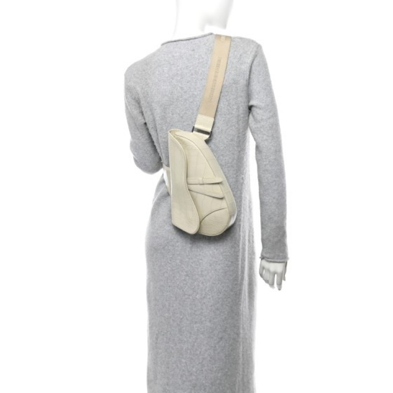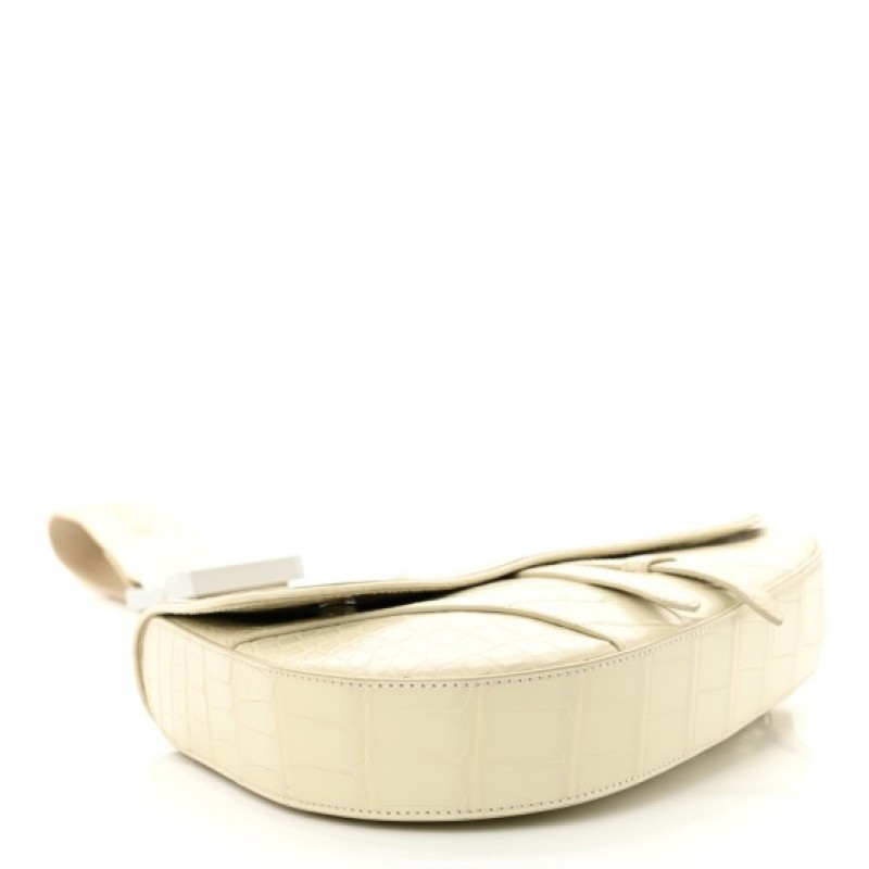 This is an authentic CHRISTIAN DIOR Crocodile Mens Saddle Bag. This stunning tote is beautifully crafted of crocodile leather in a creamy white. The bag features an adjustable nylon shoulder strap with crocodile leather trim. The front flap opens to a black leather interior.