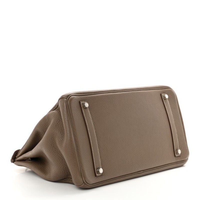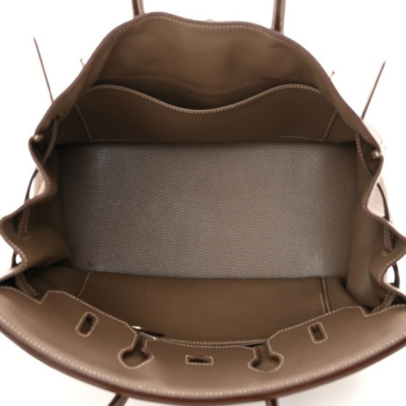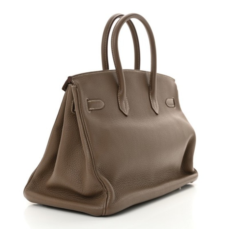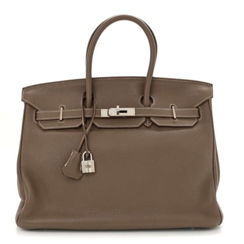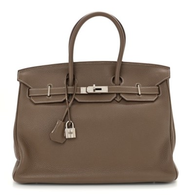 This is an authentic HERMES Togo Birkin 35 in Etoupe. This iconic handbag is finely crafted of grained calfskin leather in taupe. The bag features rolled leather top handles, palladium silver plated hardware. The front flap opens to a matching goatskin leather interior with zipper and patch pockets.